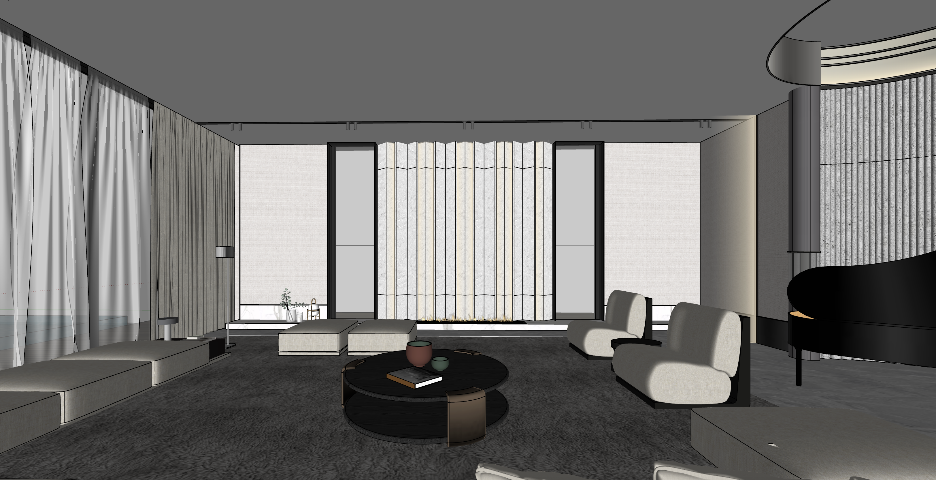 interior shot a modern luxurious living room with a sophisticated atmosphere the room features elegant off white curtains that gently flow contrasting against light gray walls soft beige sofas provide a cozy feel while a rich dark brown wooden coffee table adds warmth a sleek black grand piano stands gracefully in the corner highlighting the room s elegance the flooring is a plush charcoal gray rug that ties the space together large windows allow natural light to flood in creating a serene and inviting ambiance the atmosphere is calming with a palette of neutral tones and a touch of luxury