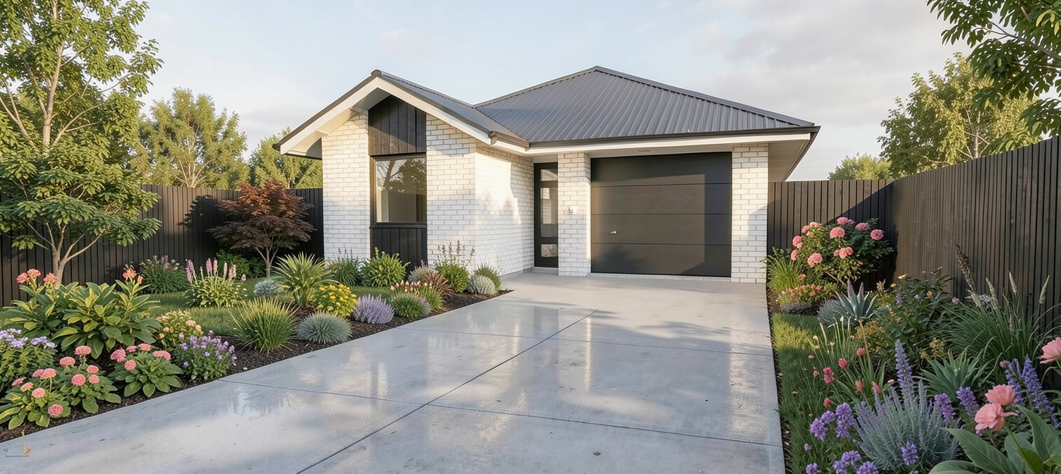 photo realistic exterior render modern style white stucco bright light green landscape