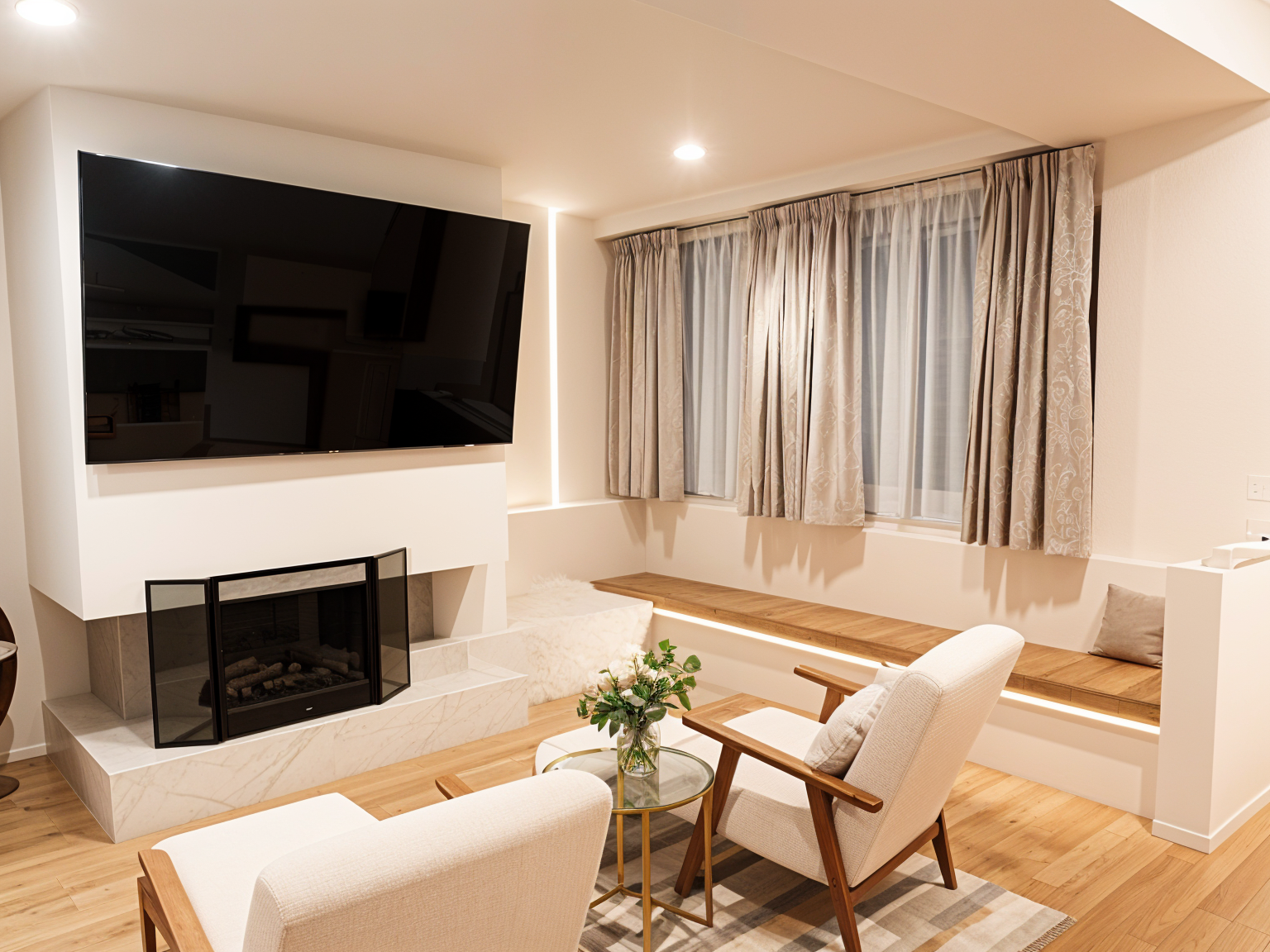 make room brighter with all white walls make realsitic add wooden floor to lounge make sofas a cream fabric make timber fire place surround realisitic show existing log burning stove inside fireplace but with no fire on add rug under coffee table and part of sofa to right