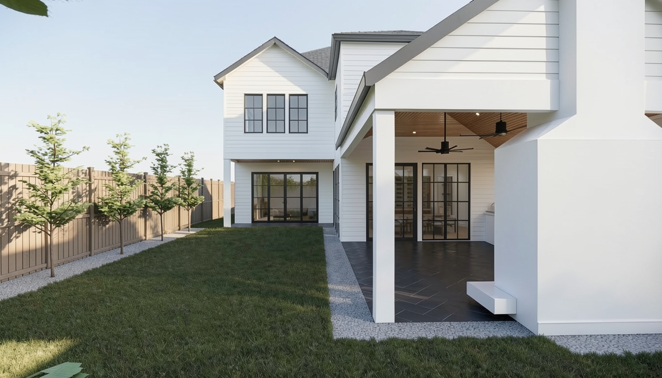 convert this architectural rendering into a highly realistic editorial style luxury outdoor photograph suitable for marketing and listing imagery maintain the exact architecture layout geometry porch structure ceiling design openings and proportions exactly as modeled do not redesign restyle or modify the architecture in any way do not move walls columns windows doors or built in elements enhance realism only through natural lighting accurate material texture subtle reflections and soft shadow depth the final result should feel like a professionally photographed architectural digest style exterior used for luxury real estate marketing materials in the space include tilebar 12x24 black slate tile flooring in a herringbone pattern hardie siding painted sherwin williams pure white roof gaf timberline shingles in charcoal color soffits and fascia painted sherwin williams origami white gutters and downspouts in charcoal finish fluted wood ceiling cladding the black slate tile should appear natural matte and slightly textured with subtle tonal variation and realistic grout lines the herringbone pattern should read clearly with correct scale and alignment the hardie siding should appear clean and refined with a smooth painted finish showing subtle shadow lines at joints and realistic exterior depth the roof shingles should appear textured and dimensional with natural variation consistent with charcoal architectural shingles the soffits and fascia in origami white should appear soft and clean with subtle tonal depth the gutters and downspouts should appear matte charcoal with realistic metal finish and clean edges the fluted wood ceiling should show realistic wood grain depth and shadow between flutes with a warm natural tone do not add or modify any furniture if furniture is present keep it minimal and secondary to the architecture without adding new elements the outdoor space should feel elevated calm and refined with a strong connection between the porch and yard lighting should include soft natural daylight with gentle exterior shadows and realistic light falloff the lighting should feel balanced and editorial not harsh or overly dramatic the final image should appear crisp photorealistic and editorial similar to a professionally photographed luxury exterior avoid warped or exaggerated wide angle distortion the perspective should feel natural as if captured by a professional architectural photographer with straight vertical lines and balanced proportions do not alter architecture layout geometry or materials only enhance realism add estate style landscaping along the fence this shiould be holly tree style lighting should be editorial style