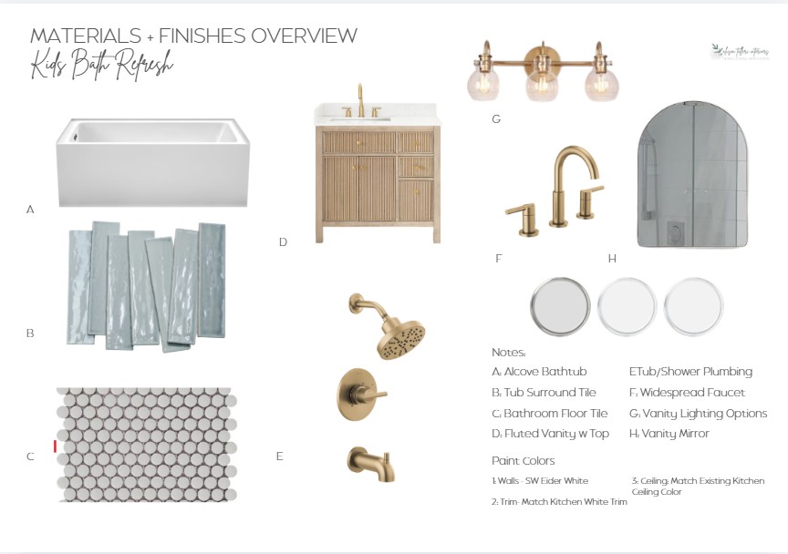 render a modern transitional guest bathroom with the selections from this mood board the blue subway tile is 2x10 and should be laid out with 2 rows of vertical stacked tile and then 1 row of horizontal tile all the way around the tub the penny tile is the bathroom floor bathroom walls should be a very light greige color