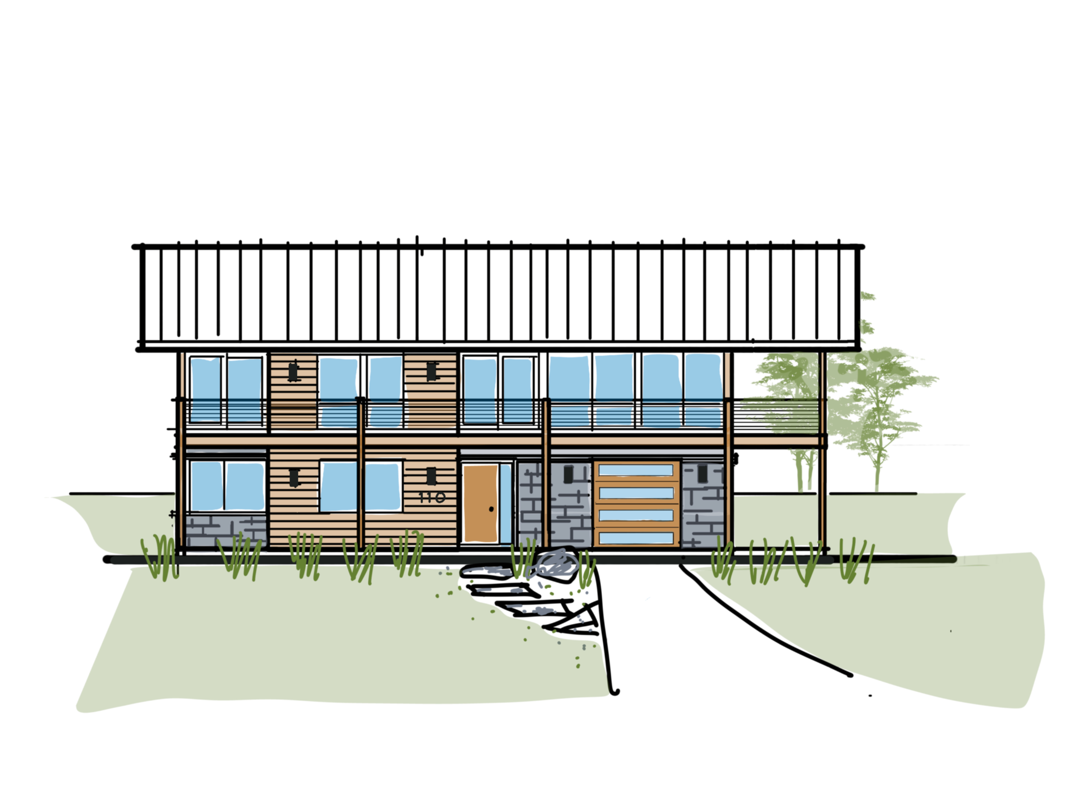 add people and lush green grass yard with modern zen landscaping trees and rocks roof is a metal gable with a low slope similar to mid century modern atomic ranch homes stone veneer on the lower level is a warm gray