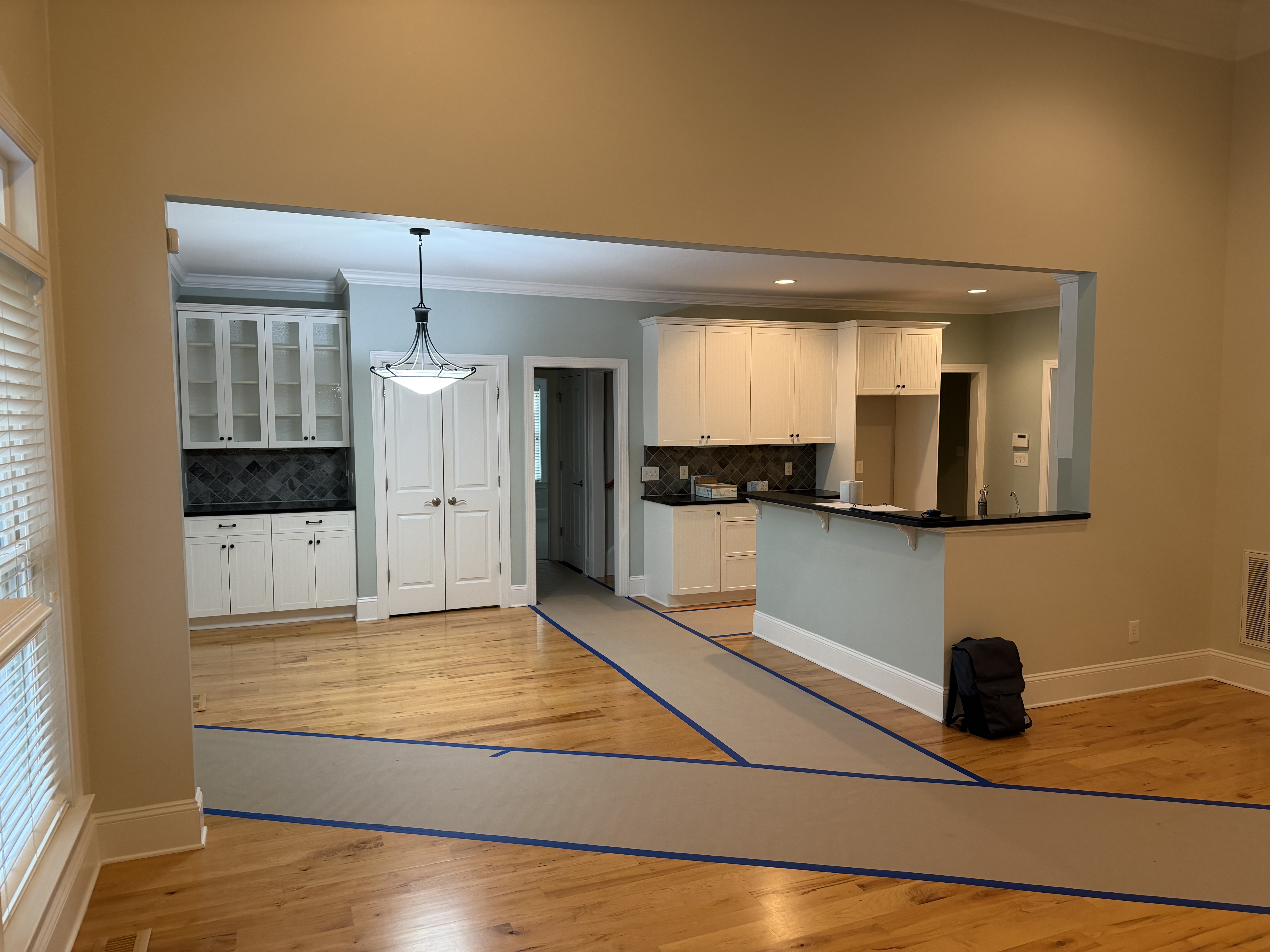 a spacious elegant kitchen and living area featuring white oak cabinets and doors for a clean modern look the walls are painted in a soothing light gray blue creating a calm atmosphere the countertops are a sleek black granite adding contrast and sophistication the hardwood floors are polished oak providing warmth and inviting tones a stylish modern chandelier hangs in the center casting soft ambient light the atmosphere is serene and welcoming perfect for relaxation and gatherings