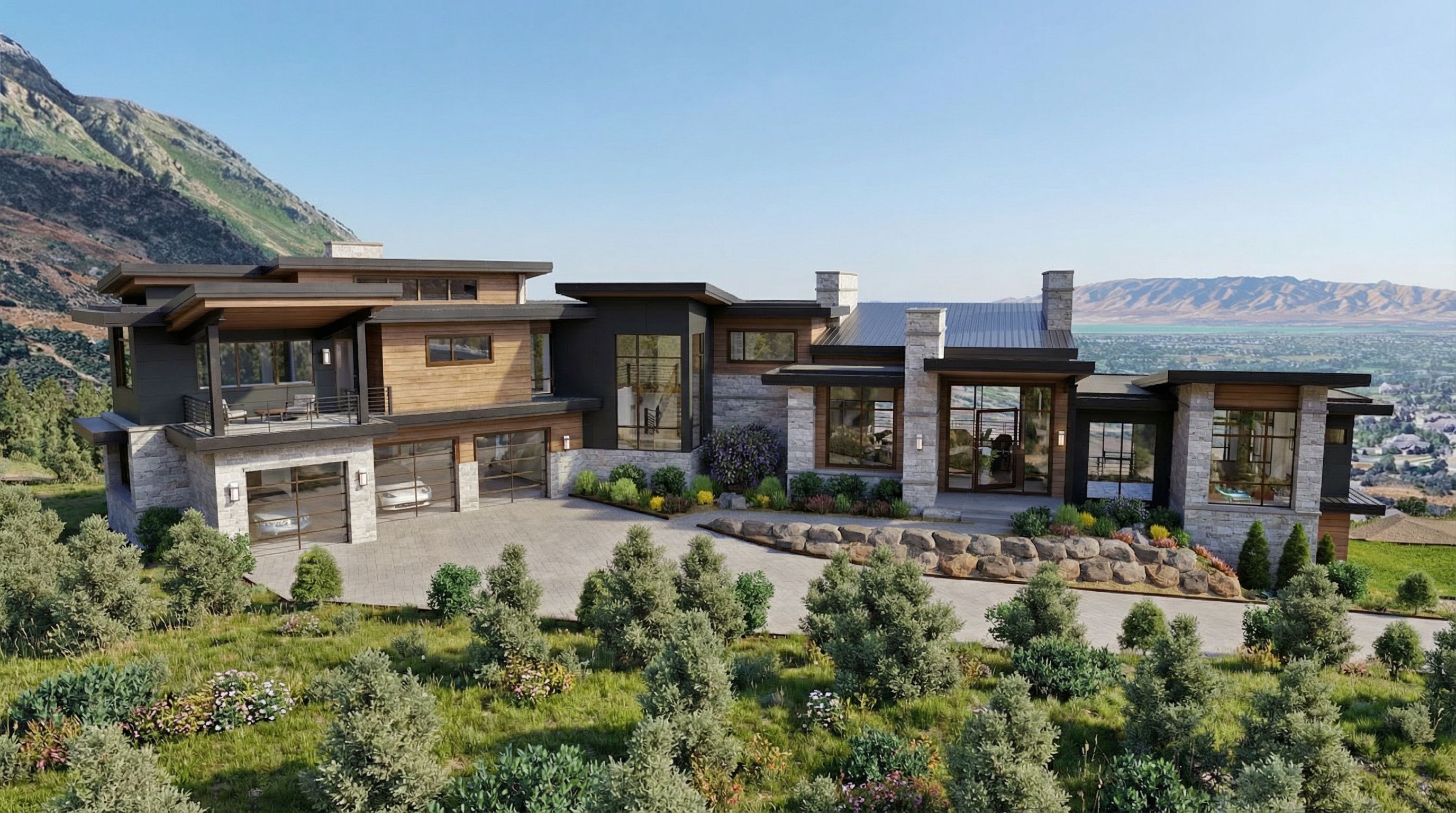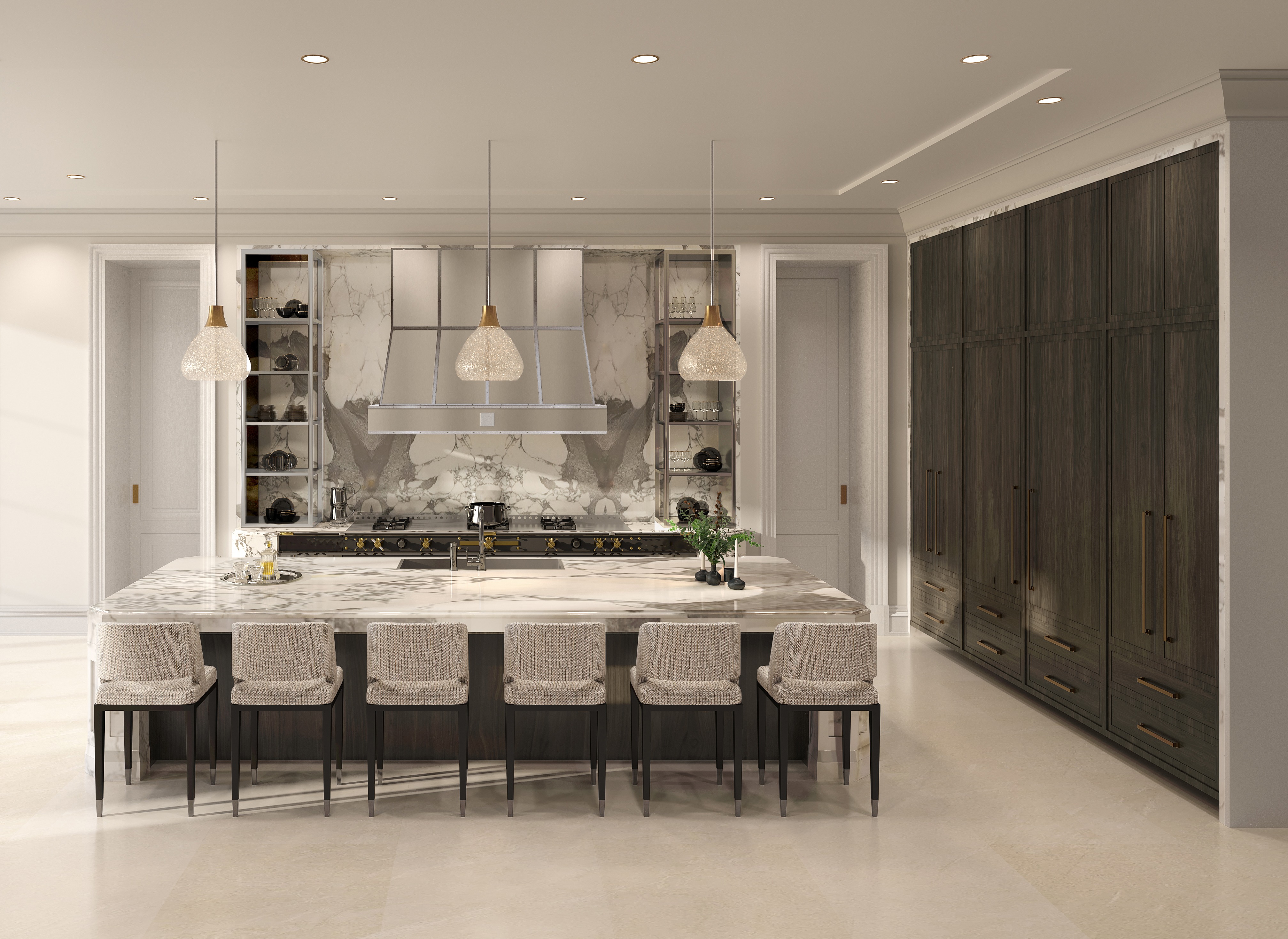 edit the existing kitchen render while preserving all original proportions lighting materials colors furniture and camera angle changes only do not add new elements change the range hood material to black taper stainless steel custom kitchen hoods with brushed brass straps adjust the island chairs spacing so they are closer together and fully aligned within the inner length of the island ensuring none of the chairs extend beyond the island edges no redesign no new props no changes to cabinetry countertops flooring or lighting maintain a highly realistic architectural rendering quality