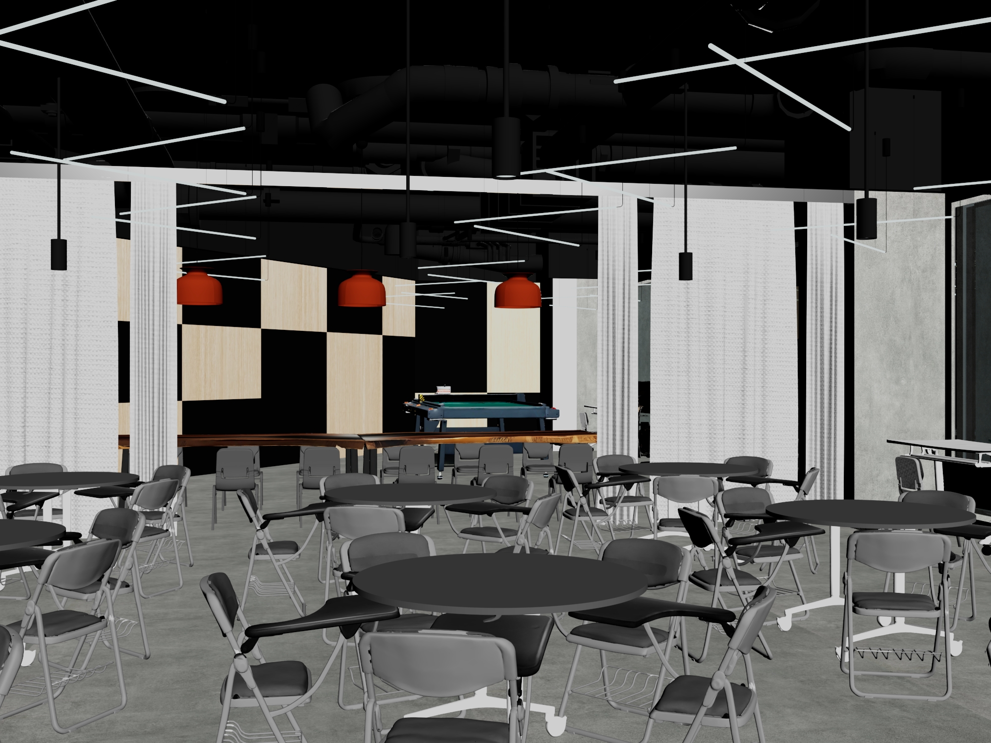 here is the final archsynth prompt with explicit lighting temperature kelvin values added while keeping all colors and materials exactly the same archsynth prompt hyper realistic classroom interior with lighting temperatures hyper realistic architectural interior rendering of a contemporary classroom learning space with an industrial modern design the space features a polished concrete floor and an exposed matte black ceiling with visible hvac ducts cable trays and suspended linear led light strips actively emitting light at 4000k arranged in a dynamic grid pattern the classroom is furnished with multiple round black tablet desks paired with ergonomic classroom chairs chair seat frames are grey and black with molded grey seats and backs black arm supports and subtle metal detailing furniture layout supports collaborative learning and flexible seating white transparent mesh curtains hang from ceiling mounted tracks acting as soft spatial dividers the curtains are neutral in tone finely woven and translucent diffusing light without altering color or material appearance primary illumination comes from cool neutral linear led ceiling strips at 4000k providing uniform ambient lighting across desks and circulation areas secondary illumination is delivered by industrial pendant bulbs emitting warm light at 2700k creating localized pools of light above the teaching and activity zone in the background a raised classroom activity area includes a pool table integrated into the learning environment set against an accent wall of alternating black and light wood acoustic panels arranged in a geometric pattern structural columns are wrapped in white textured acoustic fabric subtly reflecting both warm and cool light sources lighting is physically accurate with global illumination realistic light falloff soft shadows and correct interaction with concrete metal plastic fabric and wood materials ultra high detail photorealistic pbr materials real world scale cinematic depth true exposure balance neutral color grading no color changes no material substitutions no stylization