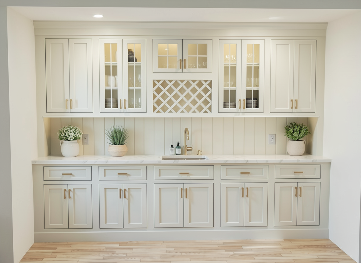 render a high end transitional wet bar from the moodboard featuring a slab of grey goose marble as the countertops and backsplash show any light fixtures as illuminated and add warm sunlight from nearby windows place appropriate bar fixtures and bottles in the scene grey goose marble has a medium grey background with think dark grey veins