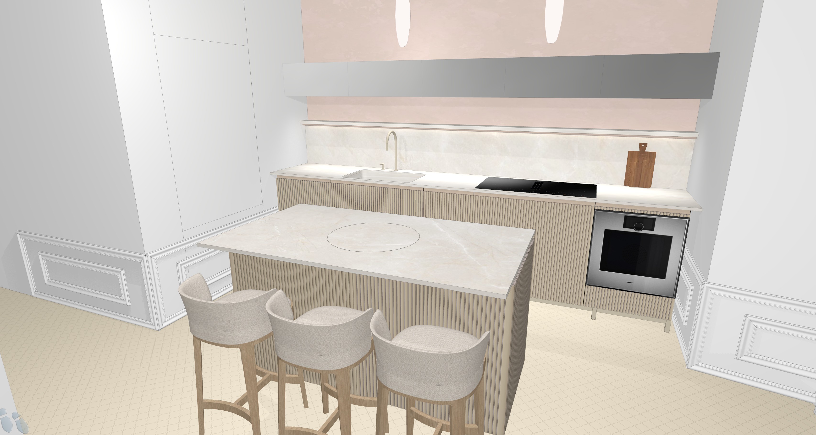 ultra photorealistic luxury kitchen interior soft natural daylight elegant parisian wall moldings central island fully clad in brushed stainless steel inox with realistic reflections subtle imperfections micro scratches fingerprints slightly uneven reflection distortion high end craftsmanship taj mahal quartzite countertop with warm beige tones and delicate veining polished natural stone integrated cooktop long linear kitchen layout lower cabinets in brushed stainless steel upper cabinets in mirror finish with realistic reflections not cgi built in stainless steel oven soft indirect lighting under cabinets light wood accents warm neutral palette cinematic lighting global illumination ray tracing physically accurate materials real world scale lens imperfections depth of field 50mm photography high dynamic range ultra detailed textures 8k v ray corona render style avoid cgi look plastic materials flat reflections perfect surfaces overly smooth metal fake lighting low detail