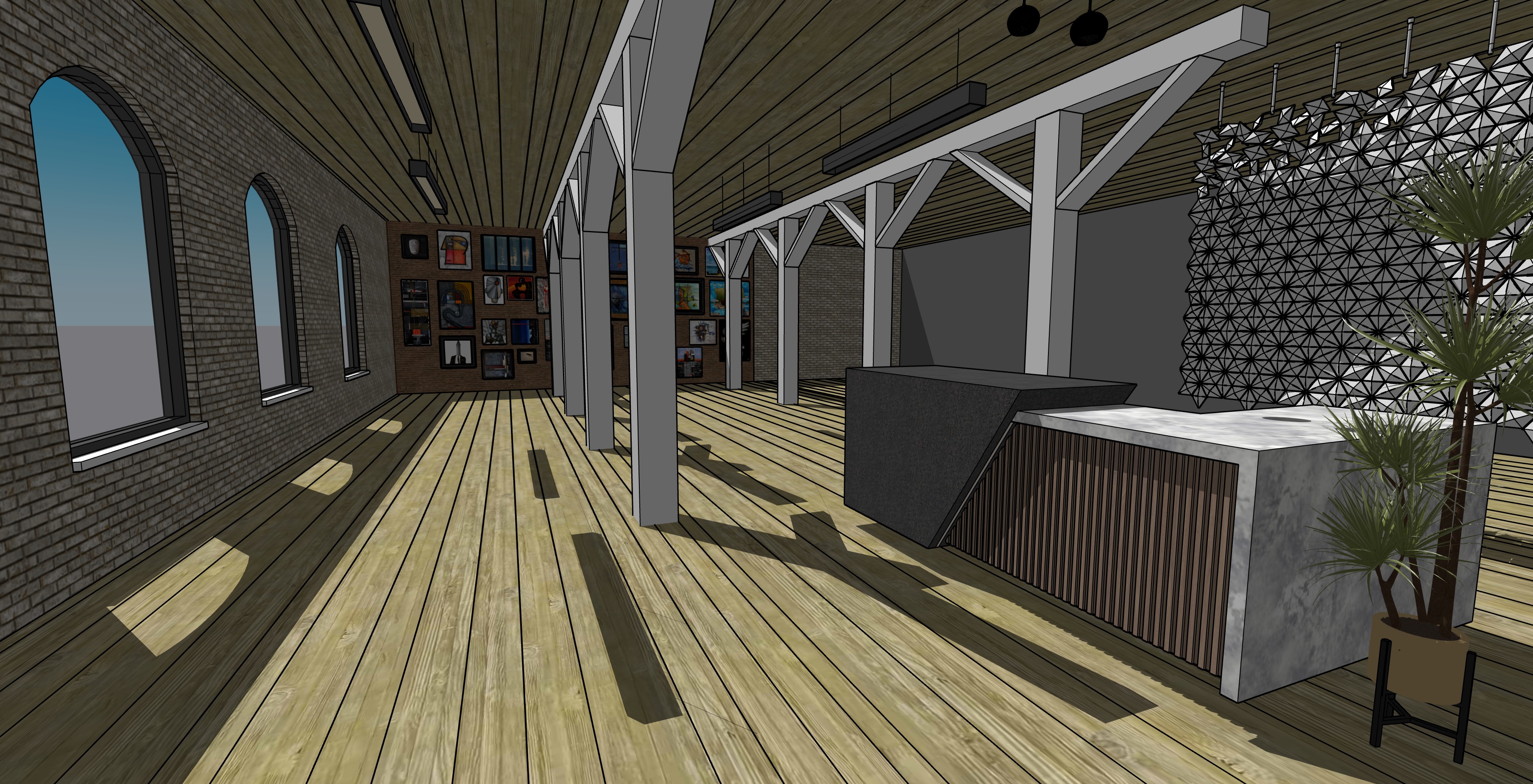 include additional seating areas to the left of scene as well as additional tropical house plants