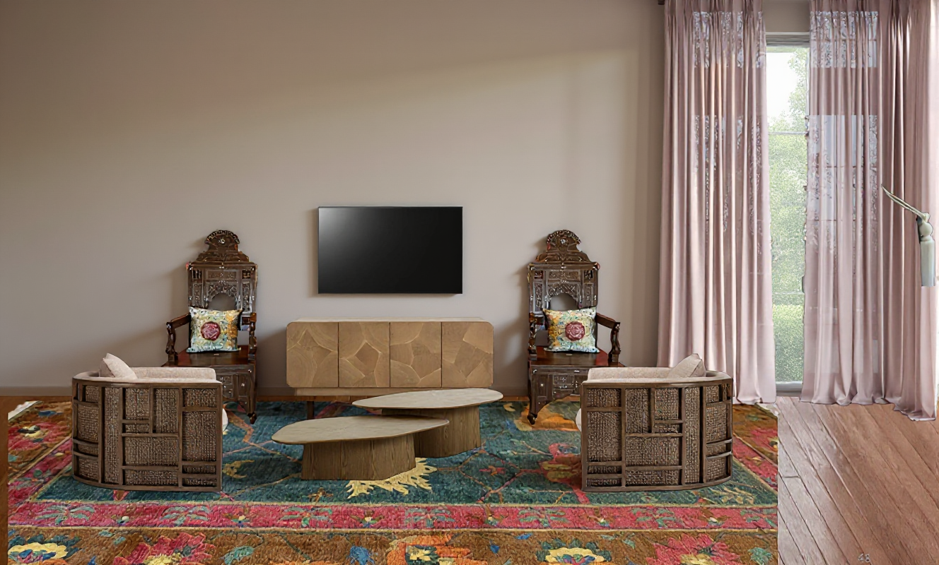 make the ceiling height 17 feet tall remove the left wall move the drapes onto the right wall make photorealistic and add natural lighting all gallery artwork above tv