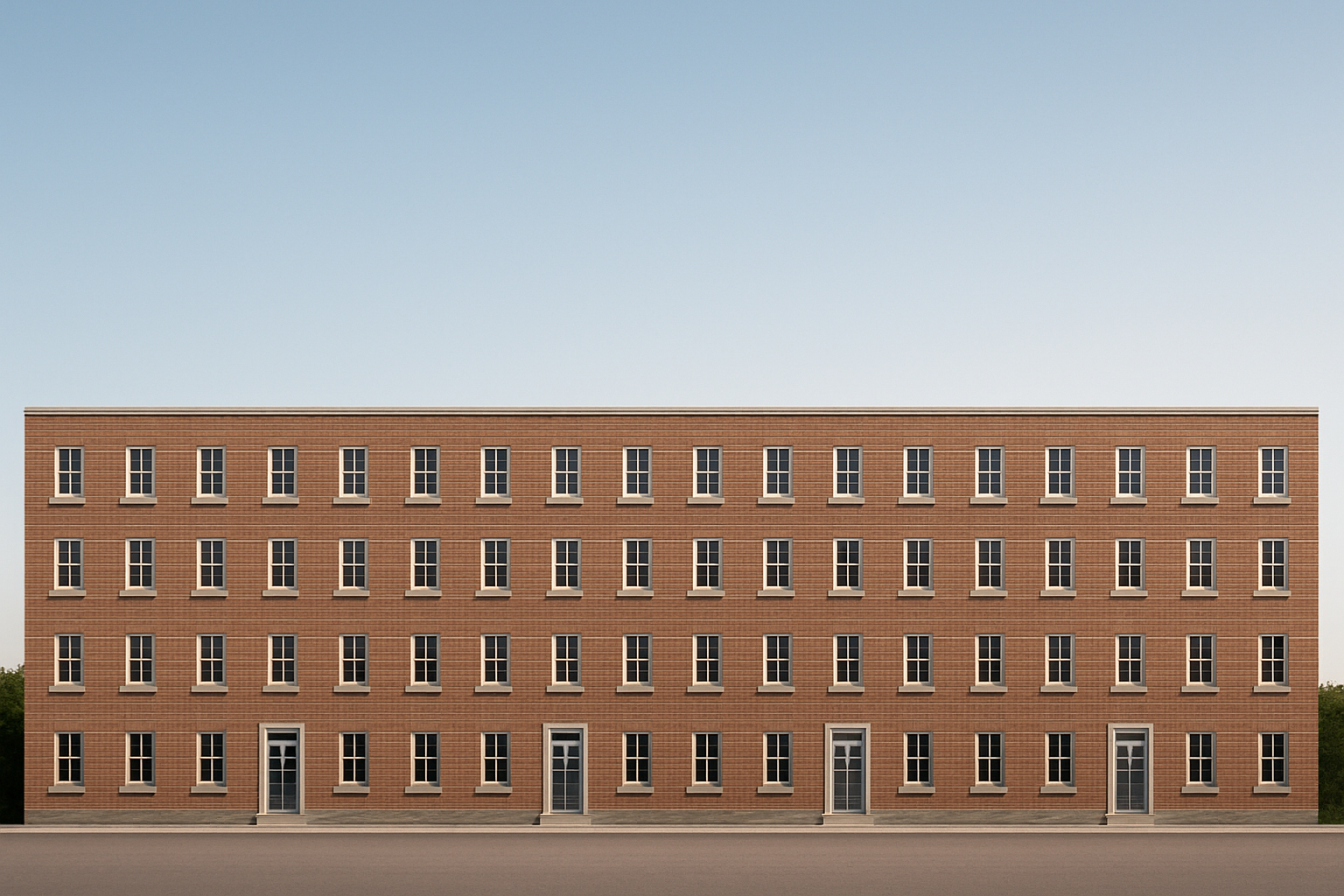 sustainable design night shot medireranean village background olive trees and aloe veras and thujas in garden french interiors in windows brass vertical stripes railings rolf benz furniture brass window frames white facade grey pieces of facade change to brass white marble pavement shining blue mosaic pool in front of every balcony two randomly distributed floor to floor vertical striped brass panels 80 by 320 cm architecture
