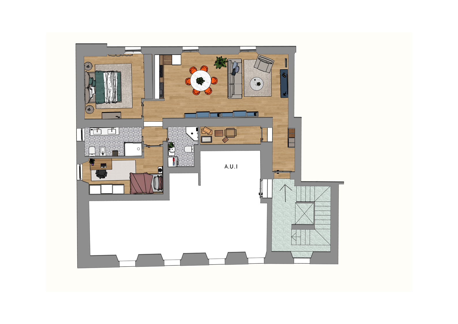 interior shot render a detailed interior floor plan with a modern and cozy ambiance use warm oak wood flooring throughout the bedroom features a deep teal bedspread with gray accents and a beige rug in the living area include a light gray sofa and orange dining chairs around a white table complemented by a soft gray couch bathrooms are styled with glossy white tiles and silver fixtures the office space has a chic white desk with a maroon office chair add indoor plants for a fresh touch and ensure natural sunlight pours through large windows creating a bright and inviting atmosphere walls are painted light gray to blend seamlessly with the overall design