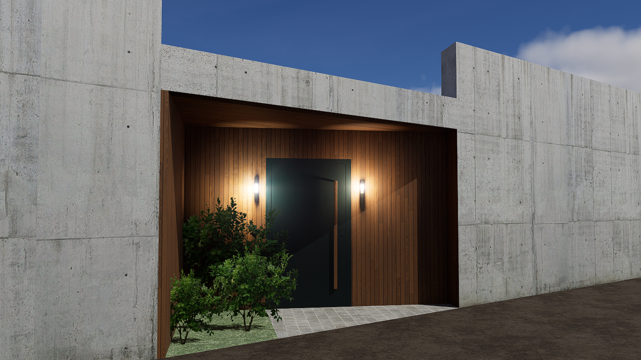 this image is the exterior entrance of the house keep the perspective and the view settings make the materials and the sky more realistic