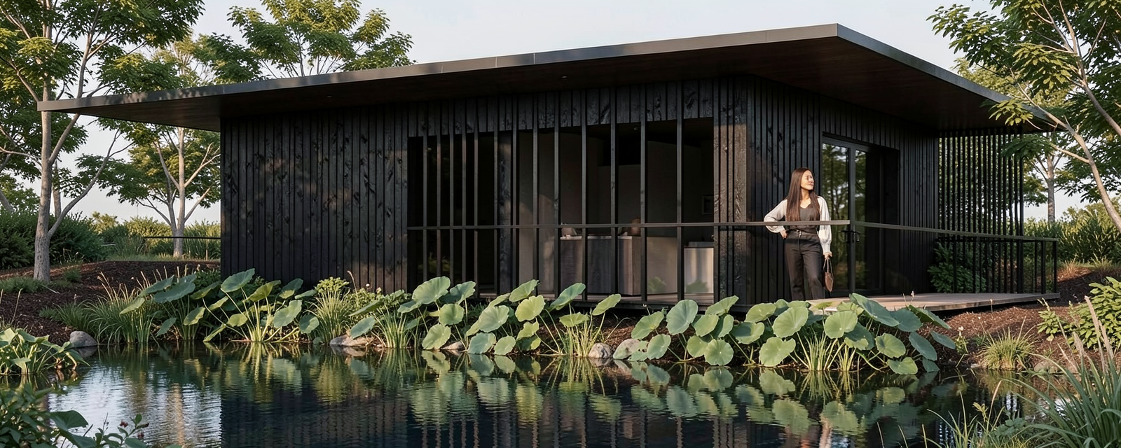 important preserve the existing geometry and the existing context exactly as provided do not modify alter reinterpret add remove scale or reshape any geometry the wall material is dark gray wood posts soffit is wood clear please make it realistic and leave the landscape as it is openings are in dark black external floor is dark black