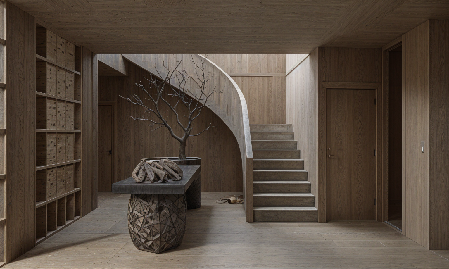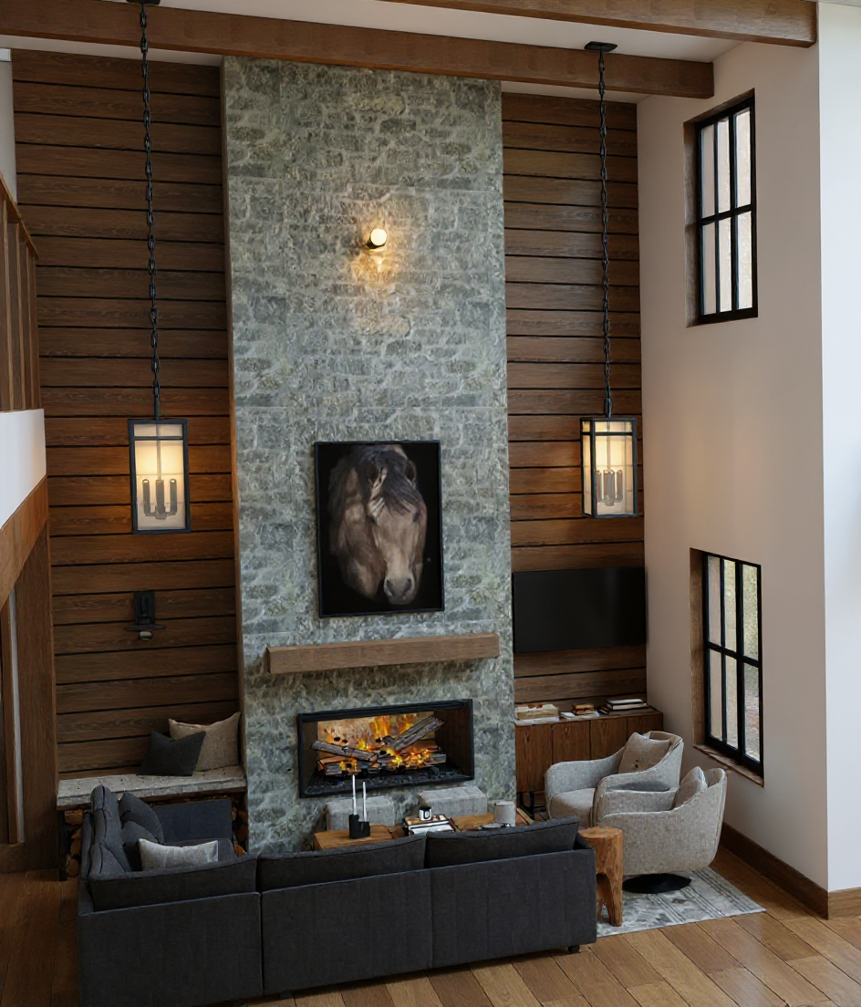 please make a realistic render with brown tones and black window frames set in a residential neighborhood with large mature trees