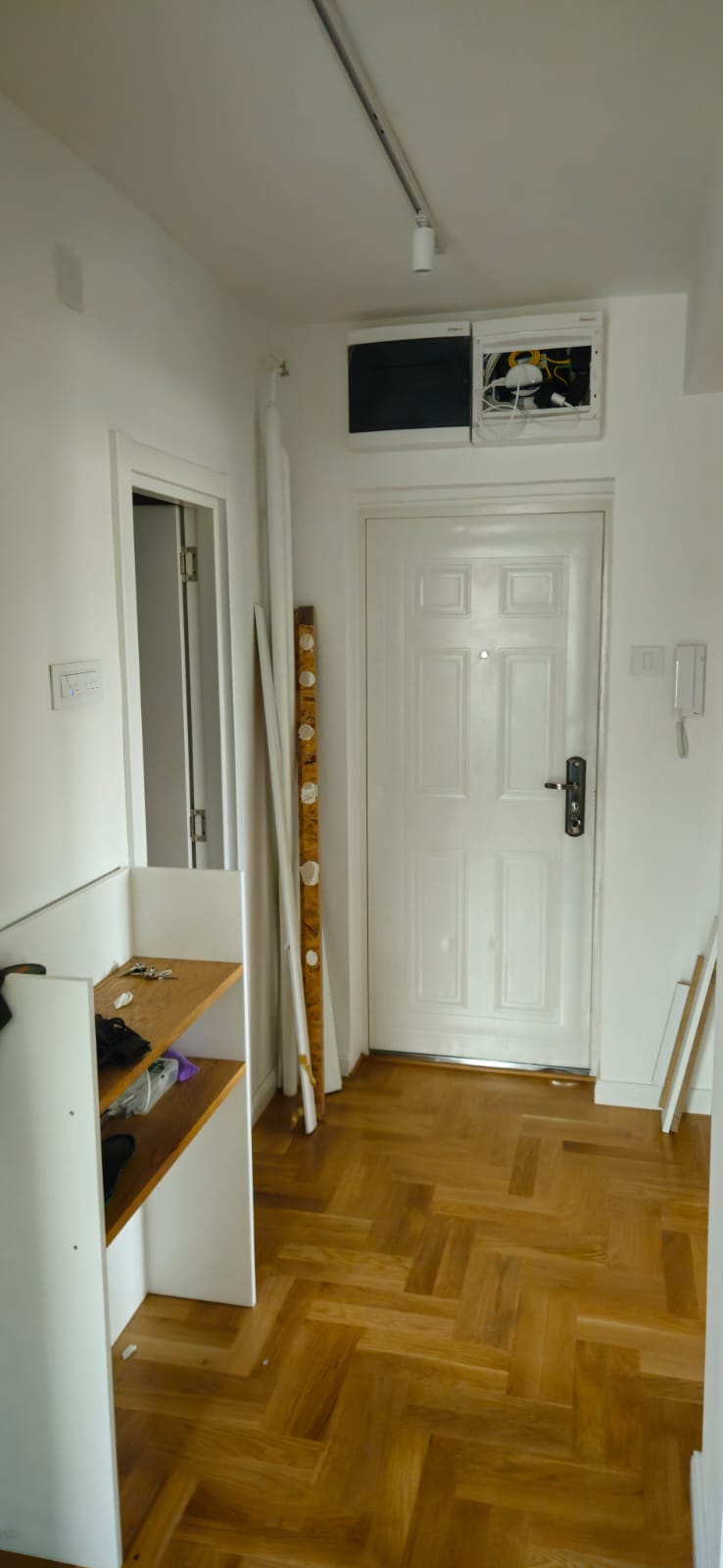 le corbusier interior shot render a modern hallway with a cozy and inviting atmosphere the walls are painted in smooth soft white complemented by a sleek white ceiling with a minimalistic track light fixture the door is a pristine white with elegant paneling and the handle in a brushed silver tone the floor features a rich warm parquet in a herringbone pattern showcasing various shades of honey and caramel browns an open shoe cabinet is positioned under a warm wooden tabletop which holds a few neatly arranged objects add subtle ambient lighting to create a warm and welcoming glow highlighting the simplicity and warmth of the design architecture