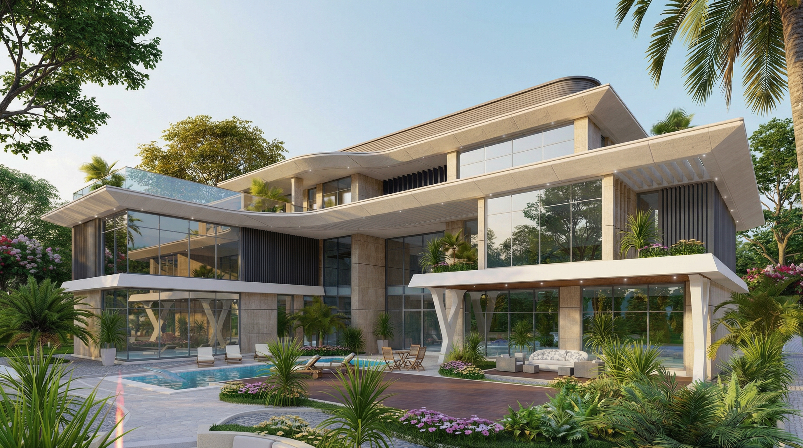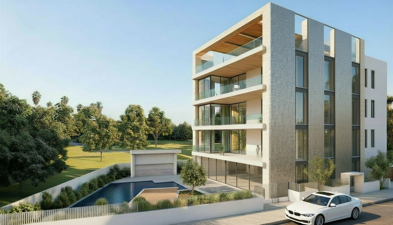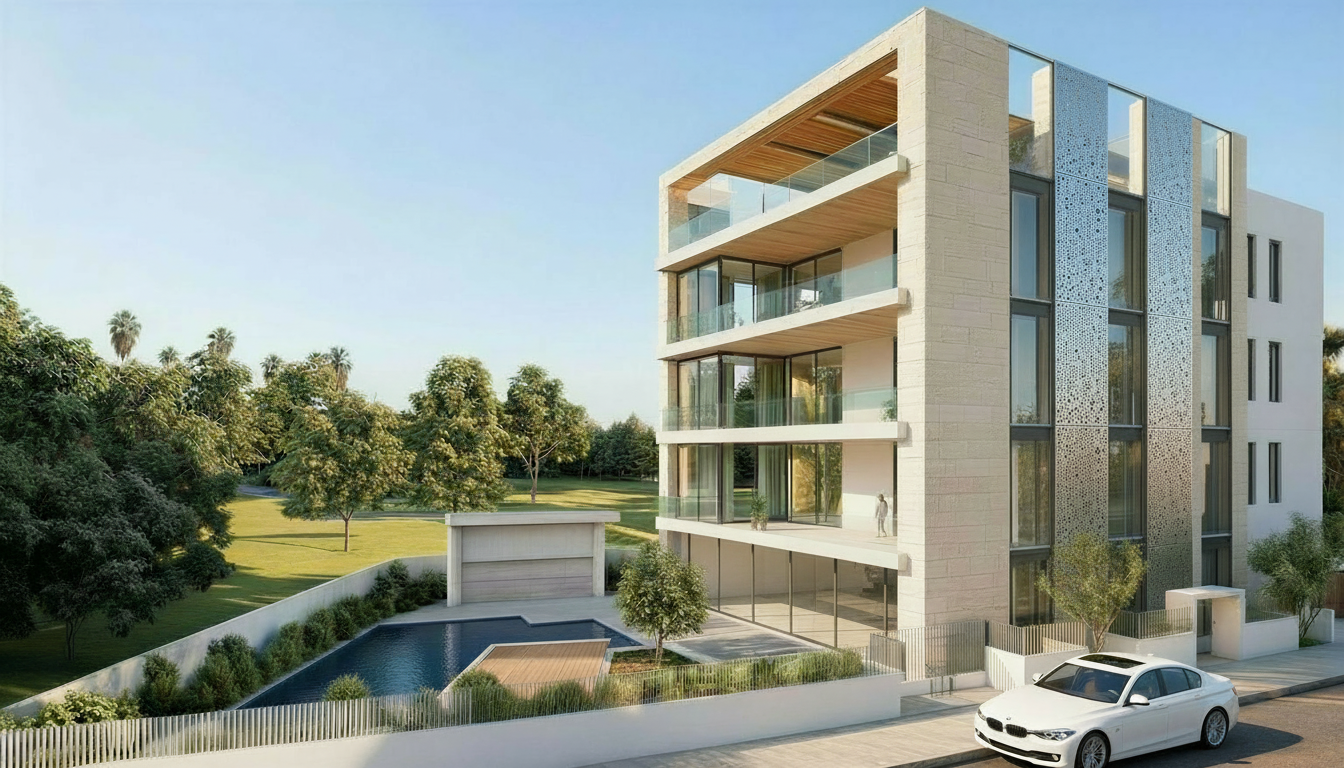 do not change the architecture shapes geometry openings balconies fa ade proportions camera angle horizon composition or any structural elements make only the stylistic updates listed below keeping the original building exactly as it is 1 lighting enhance natural daylight make the scene brighter with clean crisp sunlight and soft shadows do not change the direction of light or the time of day 2 materials and textures refine all fa ade materials without changing their geometry improve realism add subtle reflections on glazing enhance detail and quality keep the original colors and layout of the fa ade materials unless naturally adjusted by lighting 3 greenery refresh all trees plants shrubs and grass make greenery more lush and detailed realistic healthy and vibrant but natural not oversaturated 4 swimming pool enhance pool water with a deeper natural blue tone add realistic reflections from the sky and surroundings do not change the pool shape or layout 5 ground textures improve the realism of pavement road sidewalks and outdoor surfaces keep original geometry and layout unchanged 6 car replace the existing car with a modern realistic vehicle it must sit correctly on the roadway aligned with the perspective and not on the sidewalk keep scale and lighting consistent with the scene 7 people add a small realistic number of people in natural positions they should fit into the scene without drawing attention do not change the structure of the building any openings any glass frames any geometry or the general layout of the scene only improve lighting materials greenery water ground textures car and people