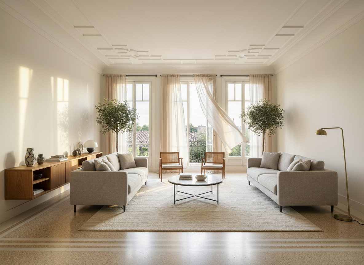 modernist interior shot photorealistic render generated from the provided sketchup 3d image as a reference strictly respect the original geometry volumes proportions architecture and all furniture visible in the source image the project represents a vip lounge located inside a football stadium with no exterior openings the space is intentionally dark enclosed and immersive lighting must be exclusively artificial with no natural light use warm soft indirect lighting that is elegant and controlled enhancing volumes and materials without overexposure the atmosphere should feel refined intimate and high end like a formal private lounge with a luxurious mood in gold amber and warm golden tones strictly preserve the original material colors color tones coming from the sketchup image textures must be interpreted in a realistic high quality way while keeping the exact original colors unchanged fully respect the color coding system present in the reference image all furniture visible in the sketchup image must be kept exactly as is no furniture decorative objects lighting fixtures screens or architectural elements may be added removed or modified color flats are functional placeholders and must be replaced only as follows any green rectangular shape must be replaced with realistic football related content such as a live tv broadcast of a football match replays or stadium atmosphere integrated credibly as a television screen any orange rectangular shape must be replaced with realistic mirrors with reflections consistent with the artificial lighting and surrounding space archsynth must take no artistic freedom do not add anything that is not explicitly requested in this prompt or clearly visible in the original sketchup image no people no implied objects no additional elements final render must be clean realistic elegant and strictly controlled architecture