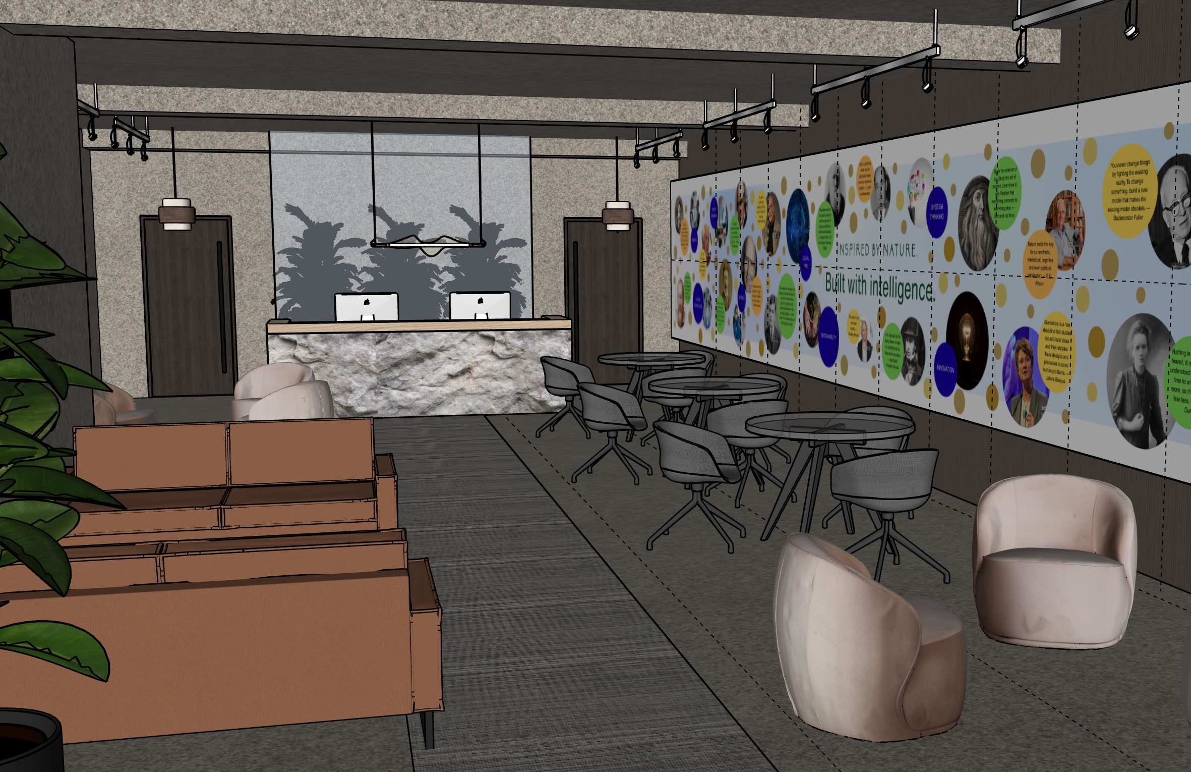 interior of a modern office lobby warm and inviting atmosphere elegant and chic design the walls and ceiling are concrete textured a rustic stone reception desk adds a natural element with two sleek computers on top comfortable leather sofas in soft tan tones provide seating alongside plush armchairs in muted blush beige the floor is covered with a textured gray carpet enhancing the cozy feel modern track lighting illuminates the room while spotlights focus on a colorful interactive wall displaying various artistic designs and inspirational quotes elegant dark wood doors frame both sides of the reception area include large green potted plants for a touch of nature behind reception desk has a glass feature wall centre walkway to reception is carpeted the rest of the floor is concrete