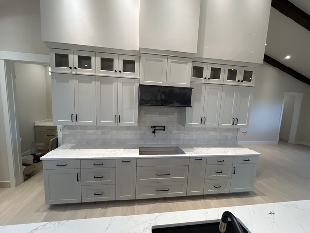 do not change the cabinets in any way preserve the exact cabinet colors materials finishes dimensions door and drawer styles hardware spacing alignment and all geometry exactly as shown do not alter the countertop shape backsplash appliances flooring lighting fixtures or wall structure only remove the construction materials clutter and mess from the scene clean the room and make it look finished and staged add a few simple tasteful home accessories appropriate for the style of the space but do not add or remove any furniture windows or architectural elements maintain the original lighting direction and realism enhance clarity and polish the photo while keeping the cabinetry and room design completely unchanged do not alter the lighting to keep the cabinet colors as they are in the image re stage for a kitchen add a cooktop into the countertop opening clean the dust off of the hood make the small glass cabinets lit