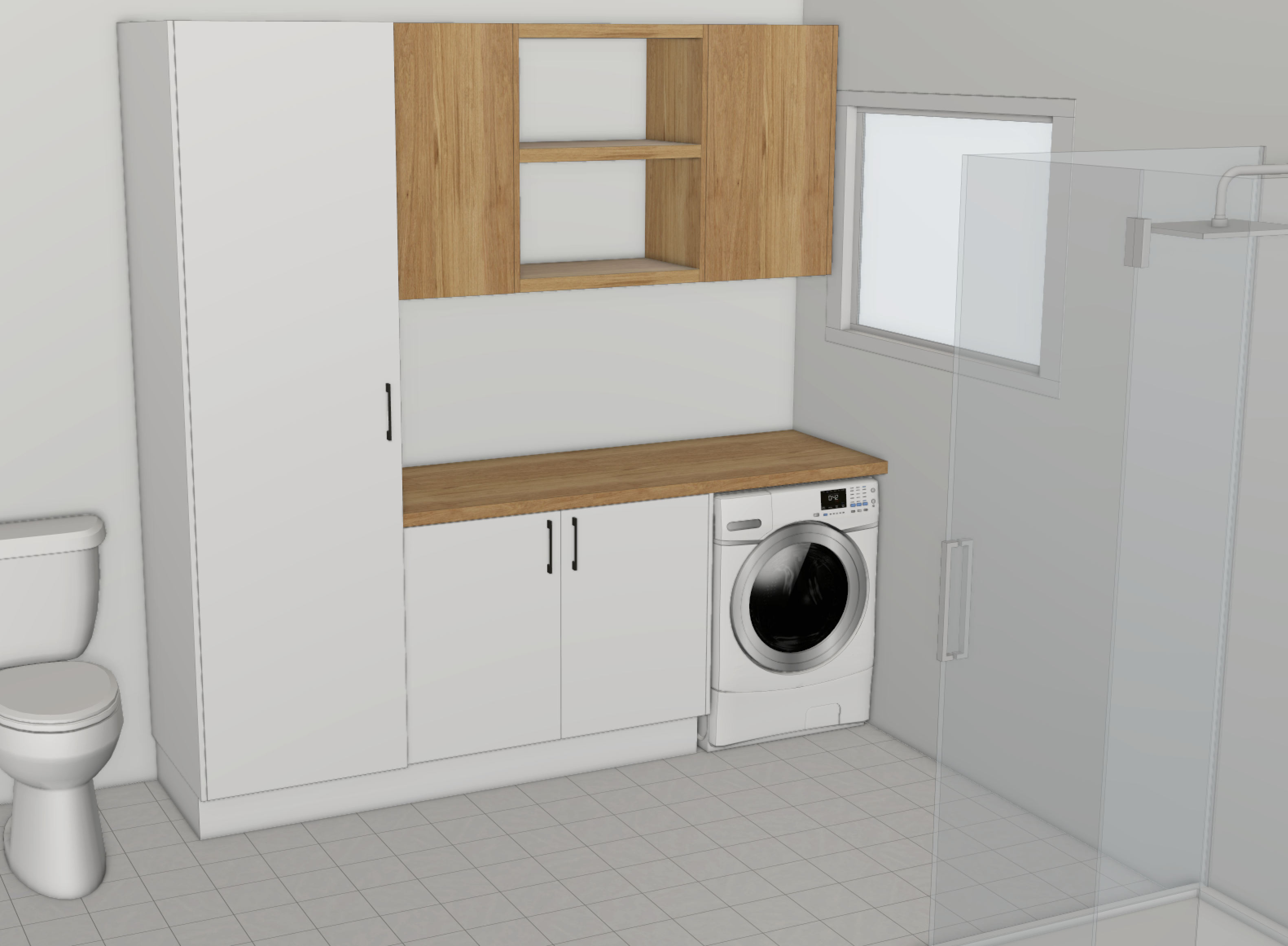 render this image make a grass mountain view out the window add plant and other laundry items to make the picture look beautiful and functional dont make it too cluttered i want to show off the joinery zoom in if required to highlight cabinetry dont show reflection on back of shower screen timber is australian blackbutt the face of the tall cabinet door is flush with the front of the timber benchtop so make them look flush the wall cabinet is 100mm off the wall as it sits over the window please render this correctly the tall cabinet is white