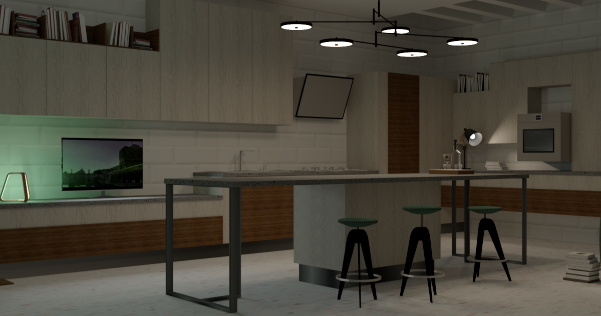 render a modern kitchen with a warm and cozy atmosphere featuring light beige wooden cabinets and dark wooden accents the countertops should be a sleek grey include a black metal frame for the island with barstools in a matte black finish and deep green cushions illuminate the space with contemporary pendant lights emitting a soft yellow glow the walls should be a soft cream color complemented by ambient green lighting under the counter include a modern oven and a stylish desk lamp with a brushed metal finish the floor should be a subtle light beige or white tile add books on the upper cabinets a tv displaying a serene cityscape and a few neat stacks of books on the counter