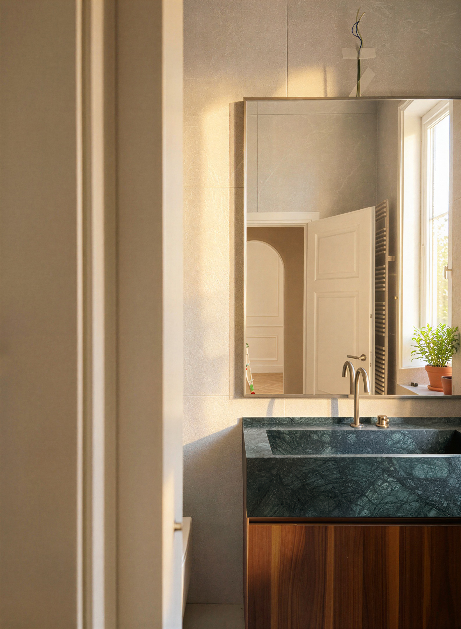 delete the small piece of a construction site ladder that can be seen reflected in the mirror under the arch