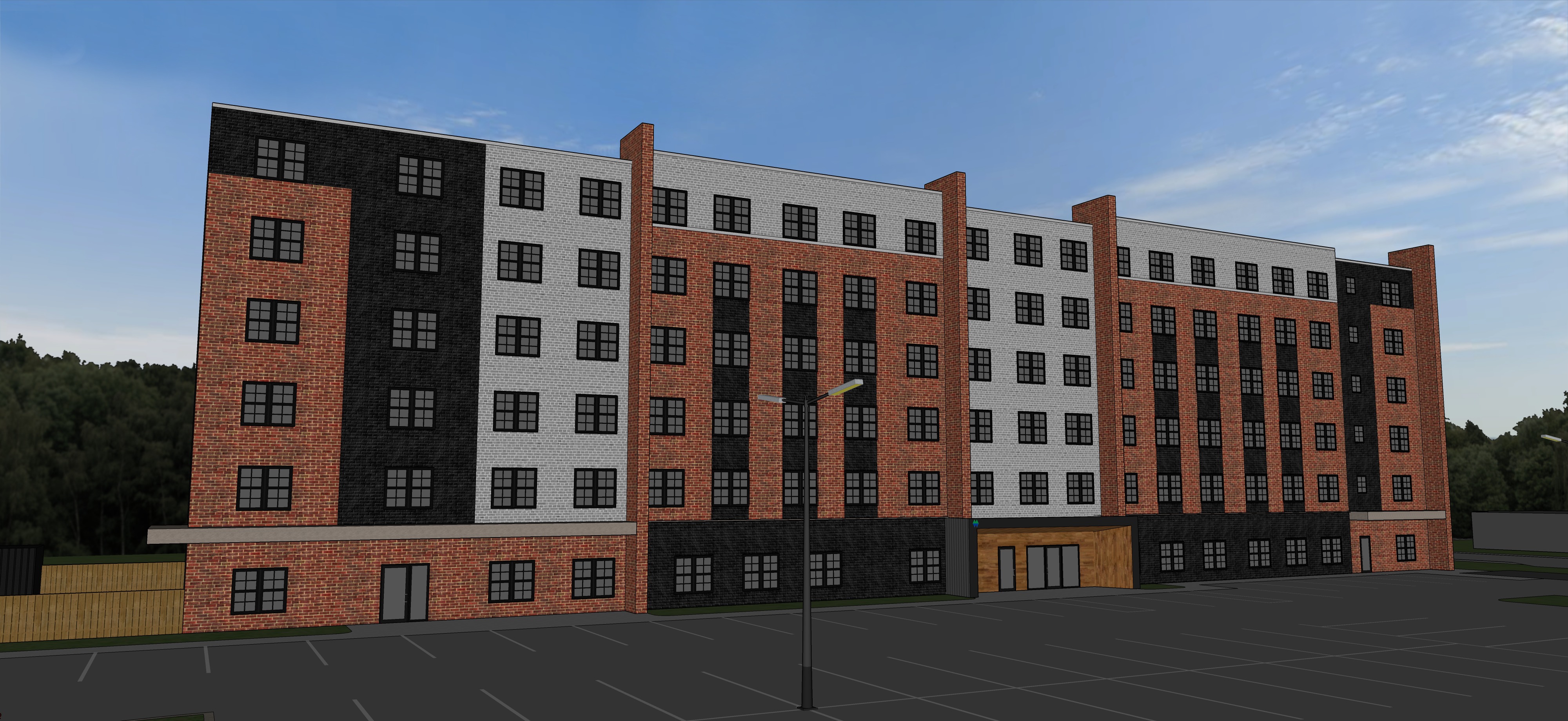 render a photorealistic 3d perspective of this brand new apartment building in bracebridge ontario on a summer day reference the current material styles and colours just enhance the black red and grey brick keep model geometry the same for windows doors and walls black decorative window mullions small town background with houses enhance the current materials glass reflections render in hyper realistic architectural visualization quality 8k resolution keep model geometry the same do not change the camera angle
