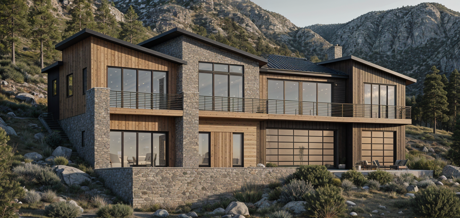mountain modern home nestled on a sloped lot in a quiet suburbs with a beautiful retaining wall out the side of the house materials used on the home are gray wood siding going both vertical and horizontal with varying widths natural stone and black siding the windows and door are all black metal front door is black