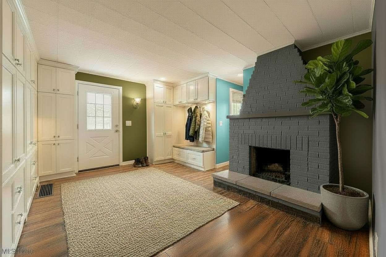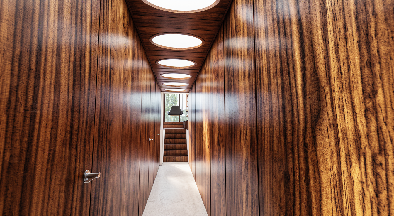 a narrow modern hallway with wooden walls in warm rich mahogany brown exuding elegance the ceiling features a series of large circular lights emitting a soft welcoming glow casting gentle shadows the floor is a sleek polished stone in a light gray adding contrast and sophistication at the end of the hallway a small staircase leads to a bright cozy room with glimpses of lush greenery and natural light pouring in creating a serene and inviting atmosphere