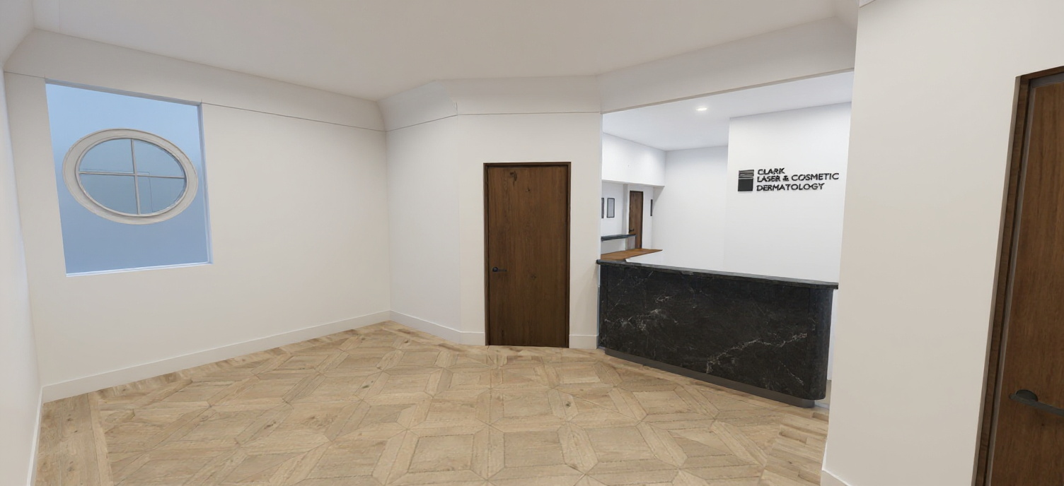 interior shot a modern dermatologist office waiting room with sleek clean lines and a minimalist design with warm wood wainscot paneling the walls are a calming warm white providing a soothing atmosphere with cove ceiling