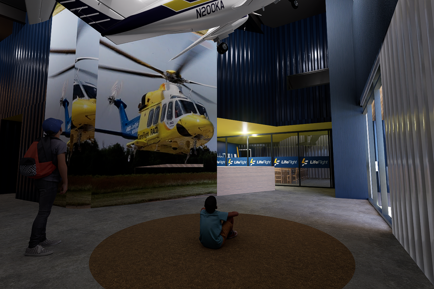 fix the repeating helipcopter image make it look like an exhibition with people and better lighting