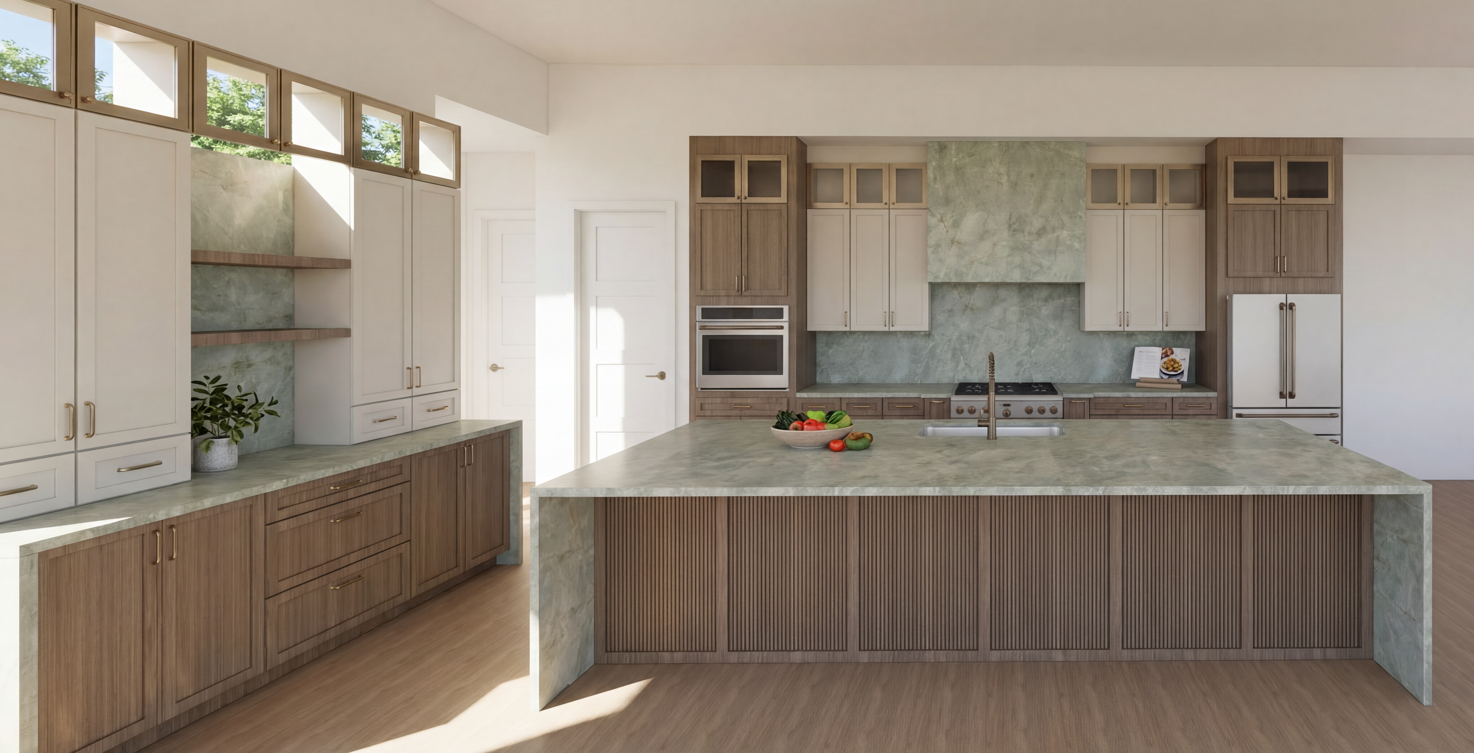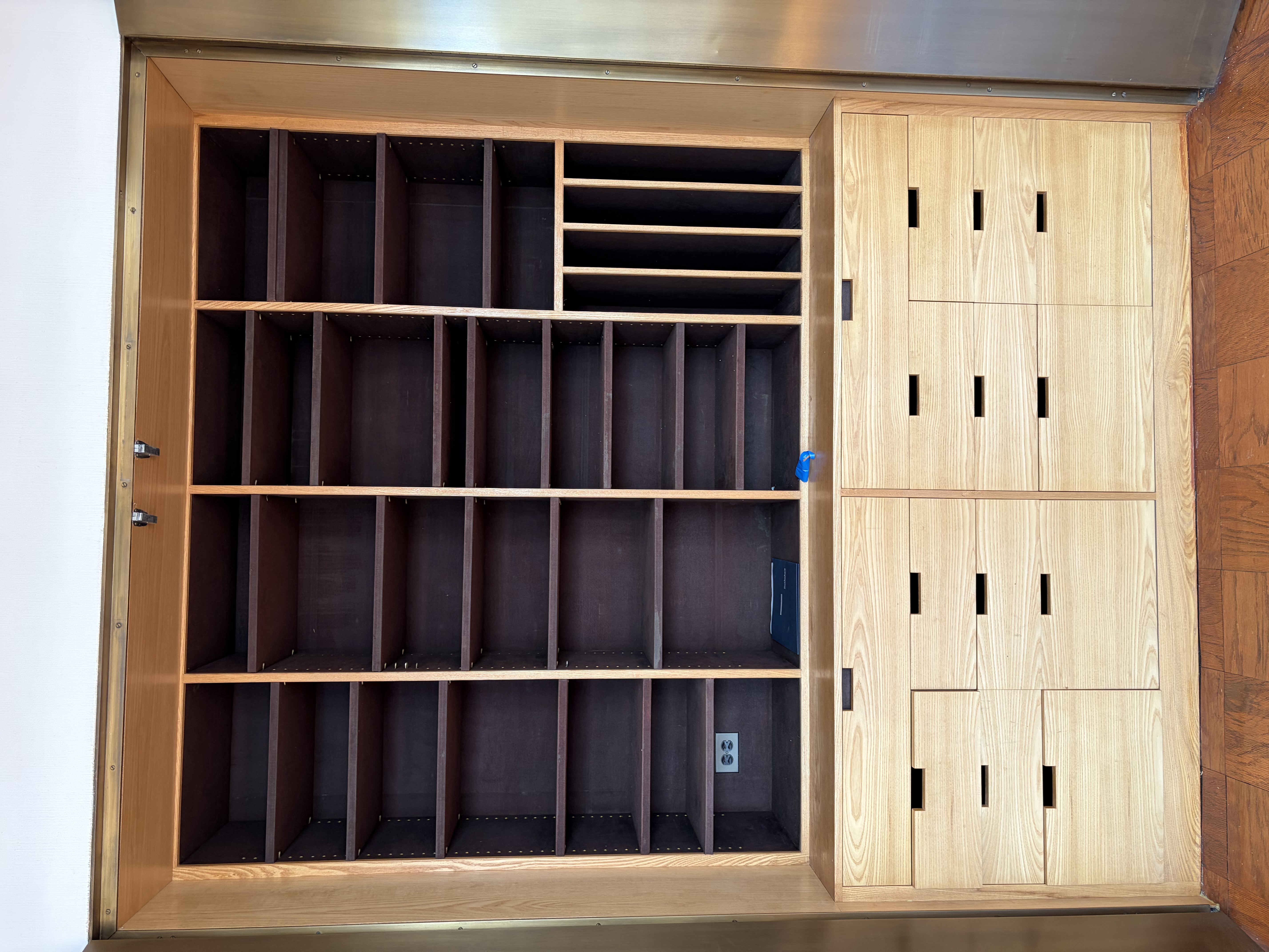 remove all open shelving and replace with mirro backing glass shelving with lighting and baccarat crystal finish the bottom drawers in a plum color by farrow and ball