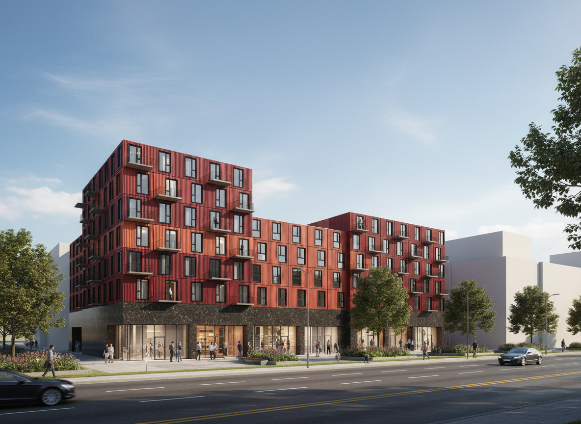 black granite plint to 4 5m large openings 3 5m high for commercial space four different green to mint tints of corrugated steel to upper facade pixelate pattern by changing direction of corrugated steel change direction of corrugated steel per volume black windows light emitting add people inside and out 2 lane road in foreground green balconies with steel strip balustrade large multistep birch trees people and cyclists