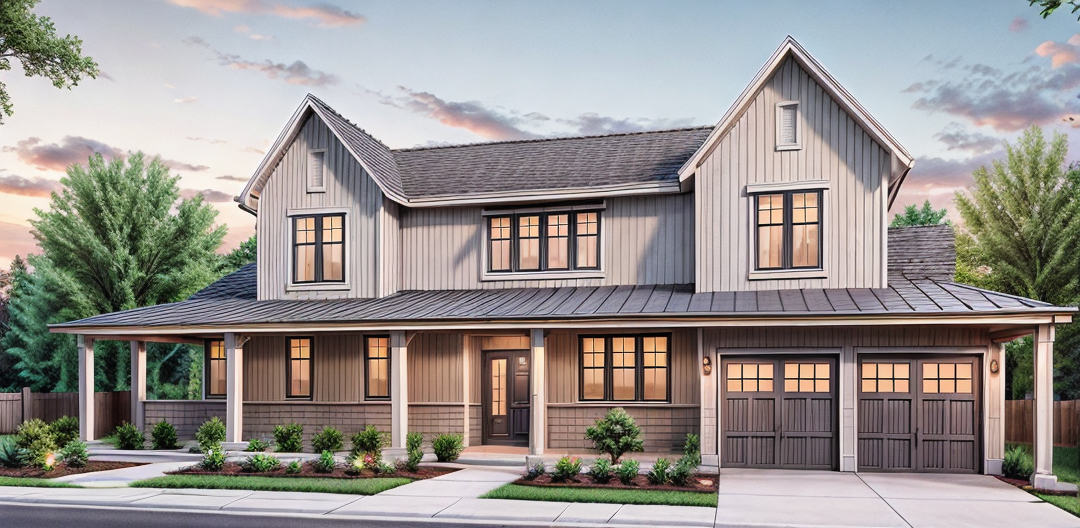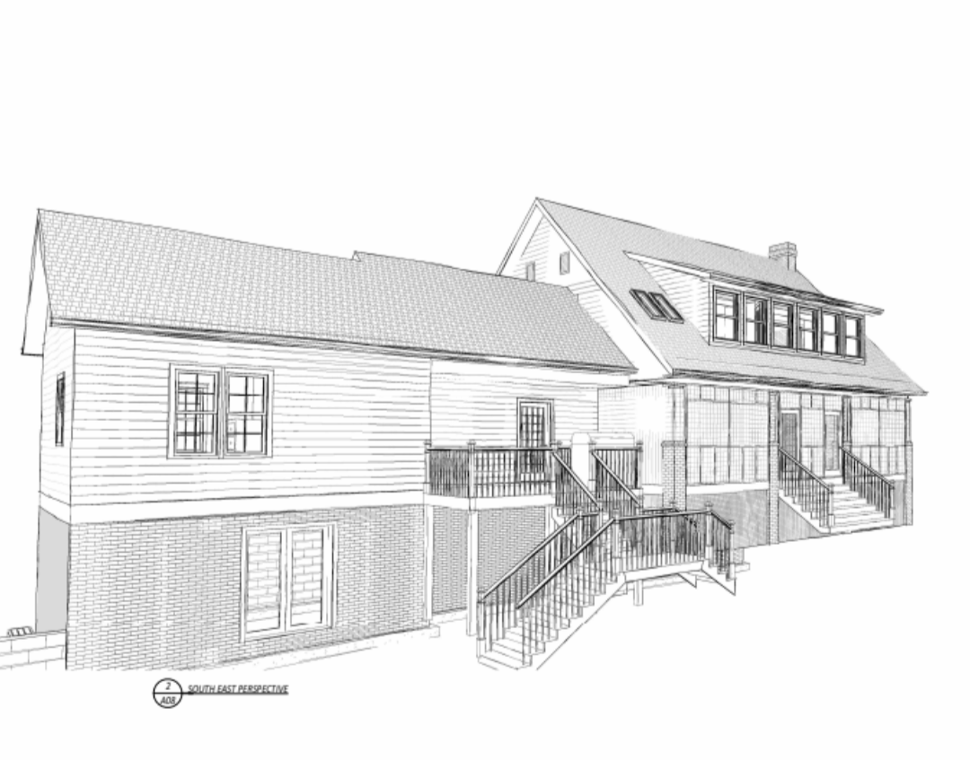 highly detailed pencil architectural rendering of a house with a shingle roof and covered front porch dark grey lap siding suggested through fine parallel line shading traditional architectural studio drawing style crisp perspective lines detailed foliage sketched in with virginia landscape plants textured graphite professional architect s hand drawn presentation black and white