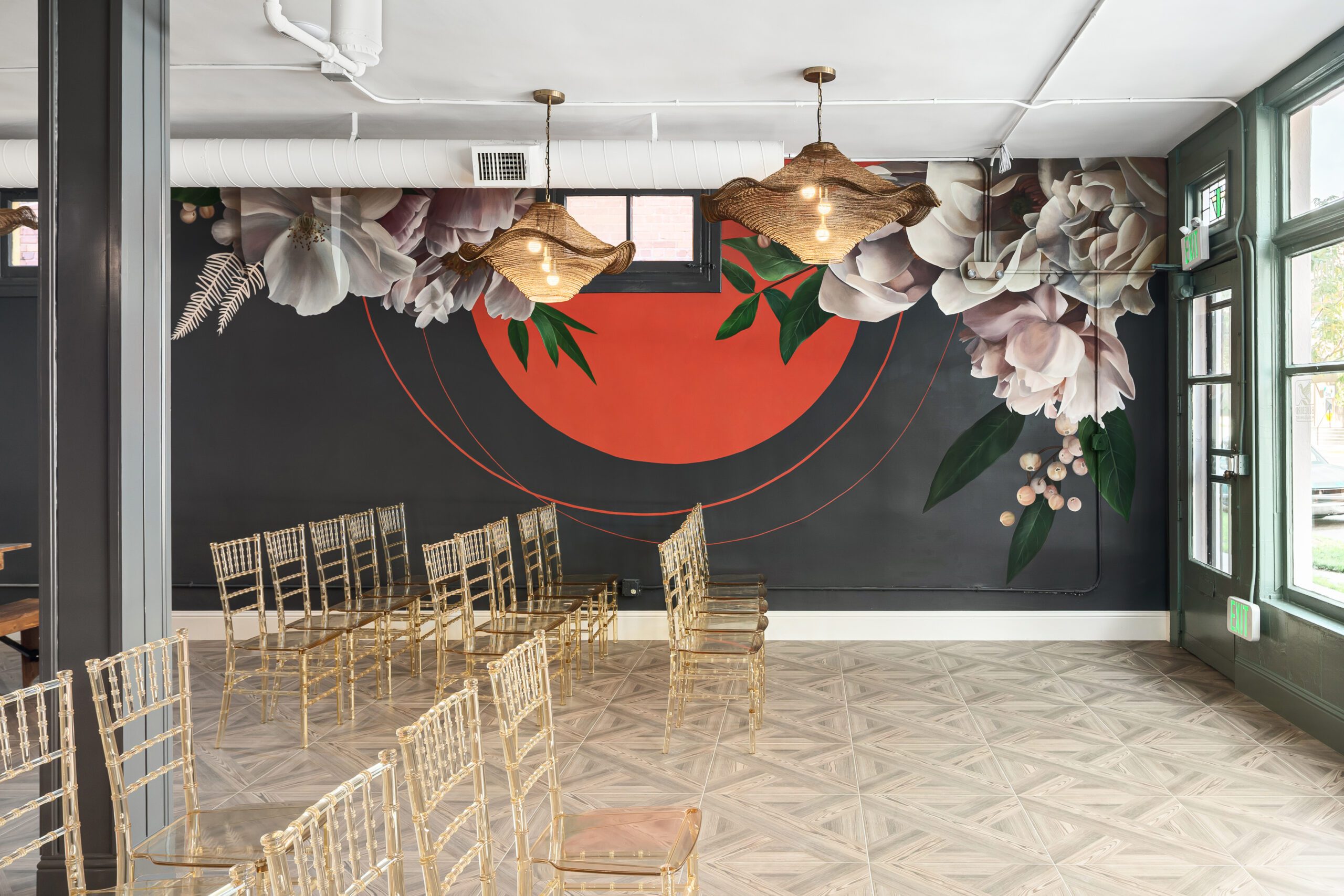 create a wedding venue scene in this room with a circular arch decorated in pink blush and white flowers turn the chairs to face the arch