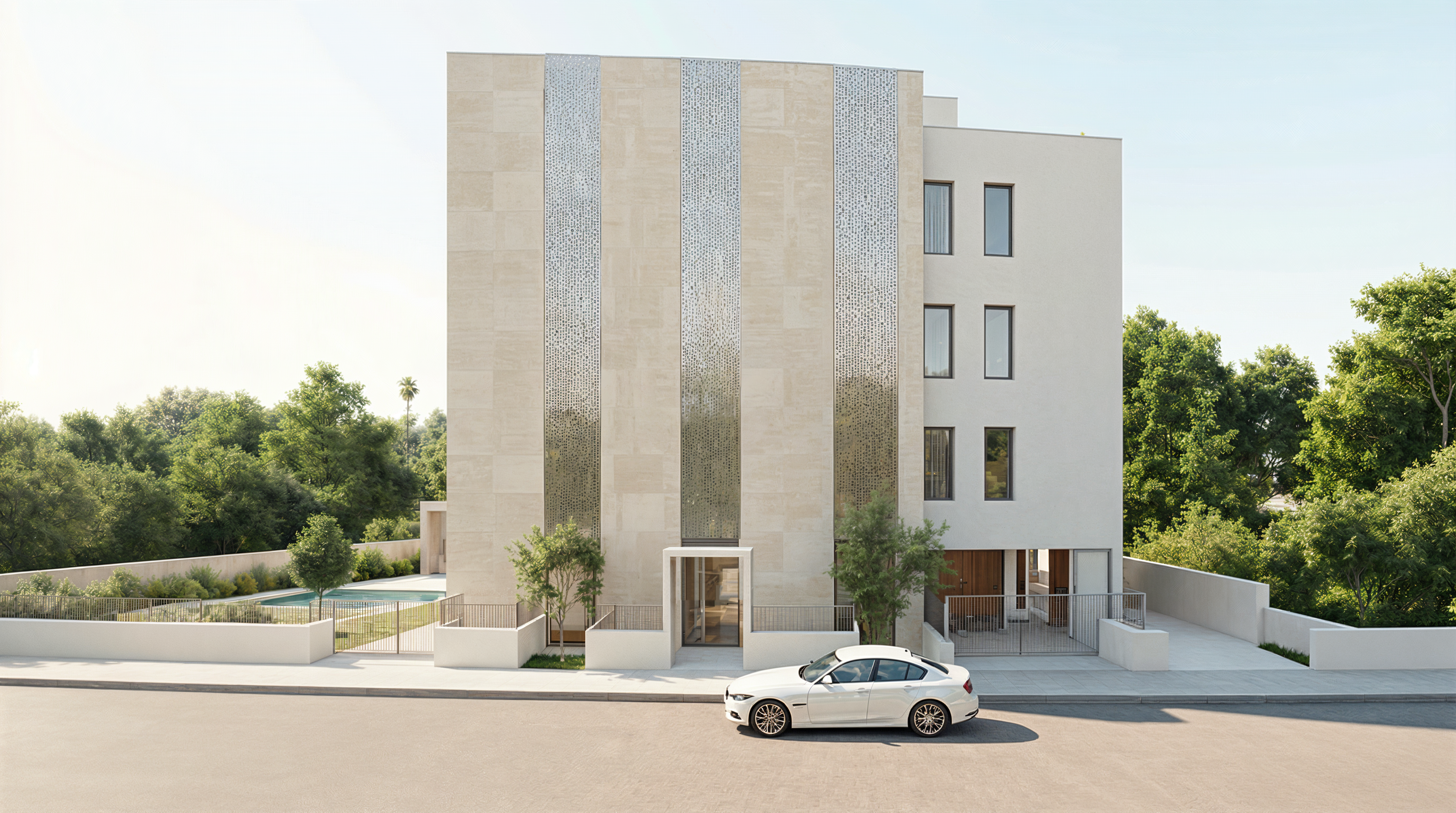 exterior shot match the sky lighting and atmosphere to the reference soft morning light pastel tones match the background environment clean park like greenery soft trees light haze no heavy contrast reproduce the travertine material exactly as in the reference image smooth uniform beige travertine with subtle horizontal pattern soft reflections no rough texture no strong seams match the white wall material to the reference clean matte white soft warm highlights match all glass subtle reflections clear transparency soft blue tint as in the reference match the swimming pool color light turquoise blue water clear reflective pastel tone overall keep the architecture unchanged only match lighting materials background and color palette to the reference high realistic render