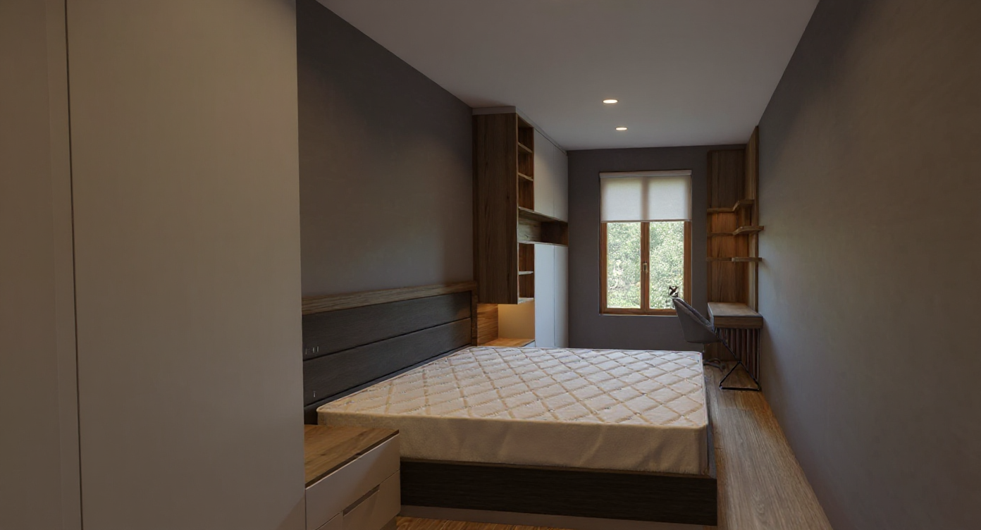 let there be leds on the shelves a painting on the bed and roller blinds on the windows