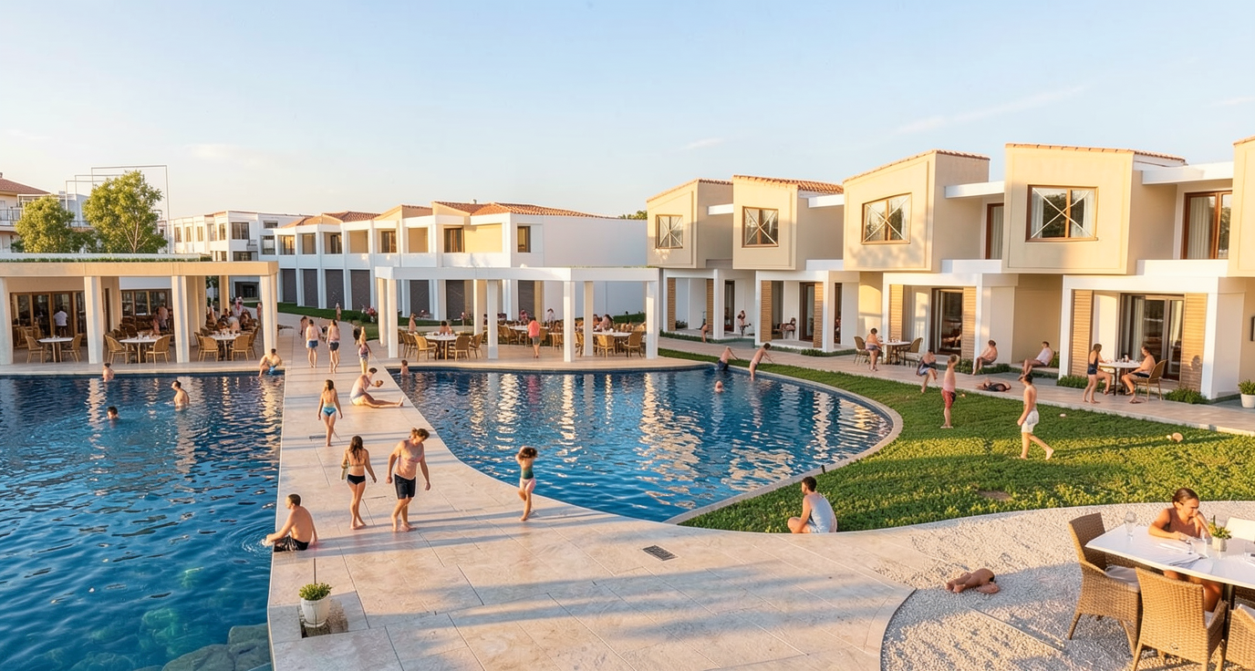 render to make look realistic maintaining the overall structure and properties do not add anything extra to the building white horizontal siding white posts and railing white horizontal boards under the deck red brick skirt white windows rear screened in deck gray metal roof