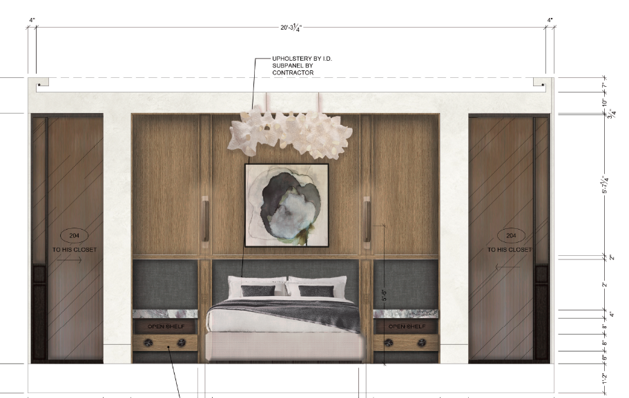 create a rendered perspective with white plaster walls wood paneled headboard recessed in a niche sconces on the wood paneling upholstered headboard inset in the wood paneling upholstered bedframe in front of the upholstered wall metal and bronze colored fluted glass doors on either side floating plaster ceiling with linear led lighting along the perimeter wide plank white oak flooring in a medium tone finish with minimal knotting