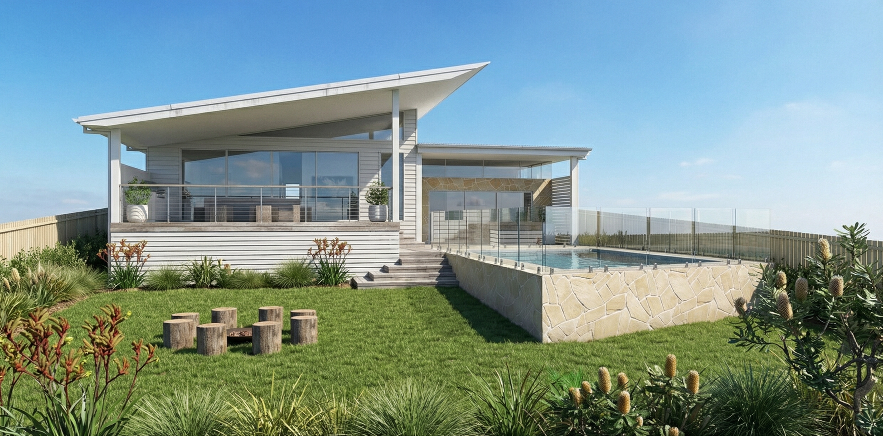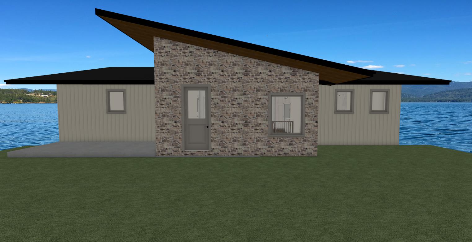 make it less animated warm up and make clearer make exterior background look more realistic make siding horizontal and cream coloured window and window trim must be a greige colour stone is tuscany rubble by canyon stone add deck at front door remove concrete slab