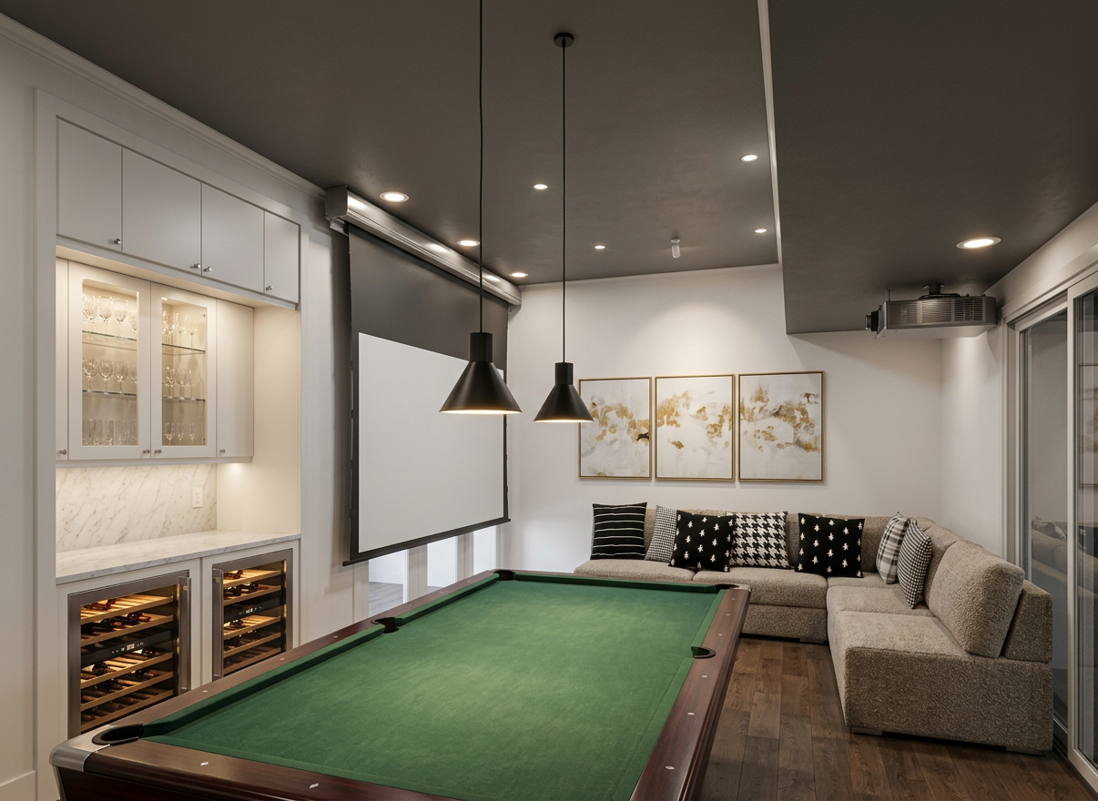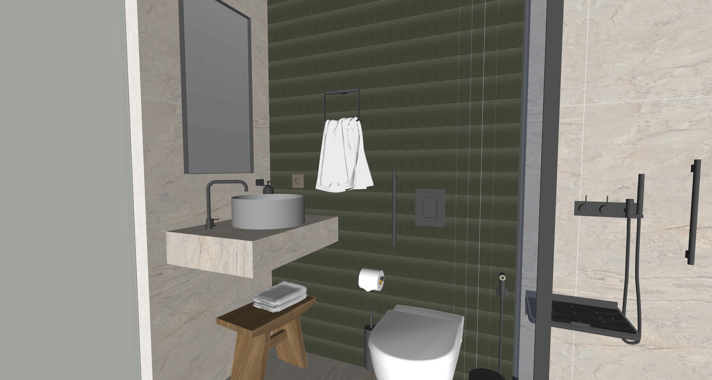 small bright matte mochagreen tile on the wall rest walls with beige matte stone tile 0 60 1 20m below sink led light and also around mirror the mirror has also metal frame with gun metal color the pots are gun metal color bathroom of a luxury villa make the materials more realistic and add realistic lighting