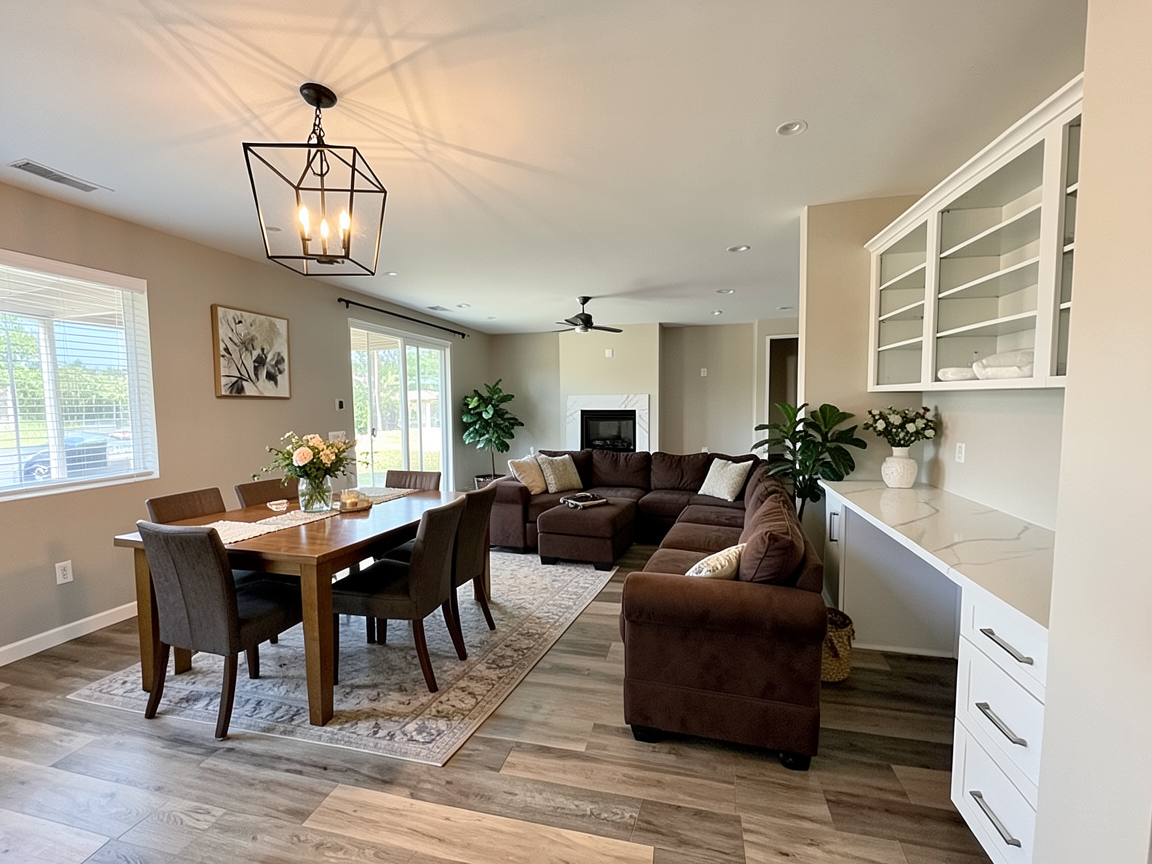 exterior shot render a luxurious modern office interior with a minimalist design use soft beige and cream for the walls and ceiling complemented by natural wooden textures for panels and shelves incorporate sleek contemporary furniture in light gray tones with leather accents add large expansive windows with sheer curtains letting in abundant natural light for a warm and inviting atmosphere include subtle green elements with potted plants to add vibrancy the lighting should be a mix of recessed warm led lights that create a sophisticated ambiance the overall atmosphere should be calm and elegant exuding a sense of professionalism and style create several sepperate offices with glass walls