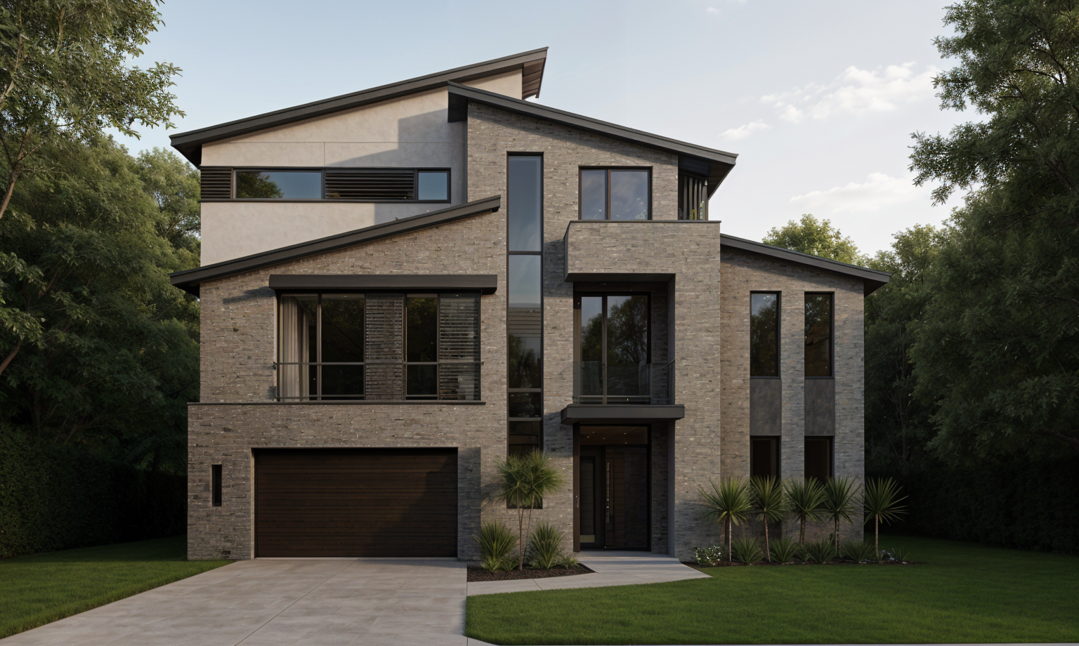 modern two story house with clean angular architecture the facade features a mix of textured white and light grey stone large windows with sleek black frames enhance the contemporary design the sloping roof is a deep charcoal color add lush green bushes and plants at the front providing vibrant contrast the garage door is a sophisticated light grey overall aim for a peaceful elegant atmosphere with soft natural lighting architecture