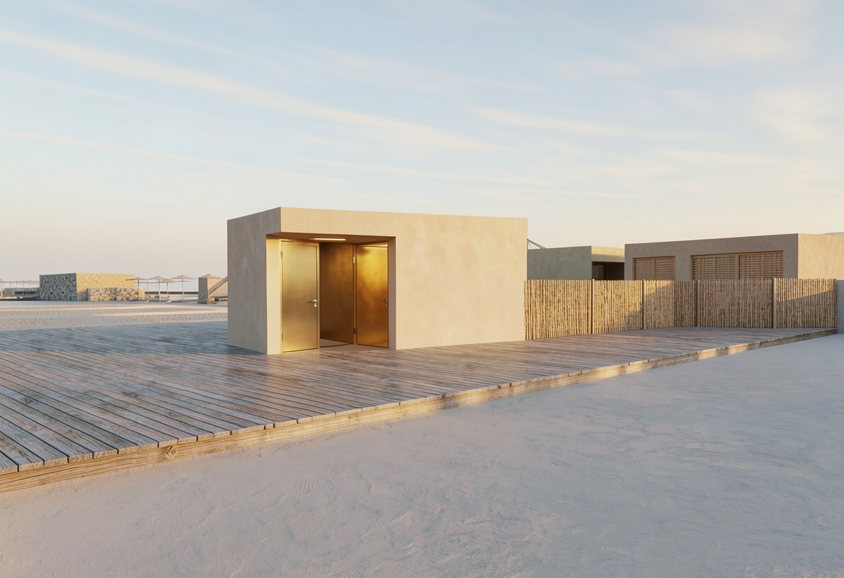 make this sketchup screenshot look like a real photograph with realistic textures materials and realistic pleasant summer lighting add some people to make it look like a nice street do not add or edit any components