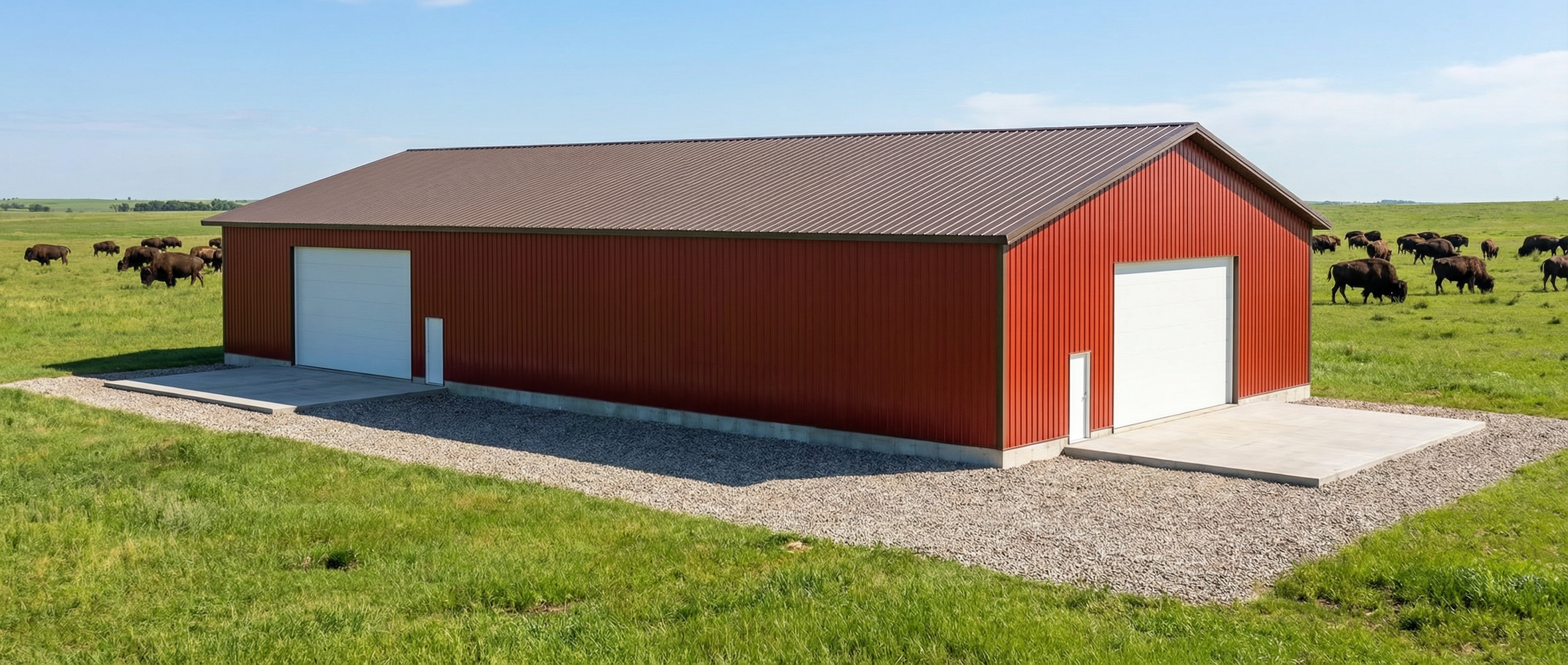 make this building look real and keep the colors the same put concrete approaches in front of the doors and gravel in between make it a sunny day with green pasture in the background and a herd of bison in the distance remove the concrete ribbon at the bottom of the building that appears as a curb
