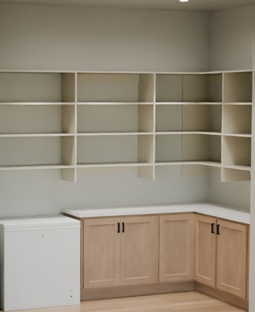 wall shelving is light beige painted and base cabinets are stained keep those finishes