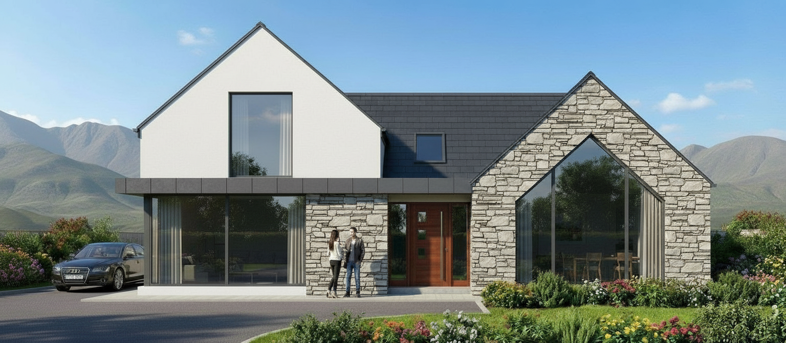 make this render look realistic add some trees in the foreground and background add some stone paved paths do not change the building and its textures and color