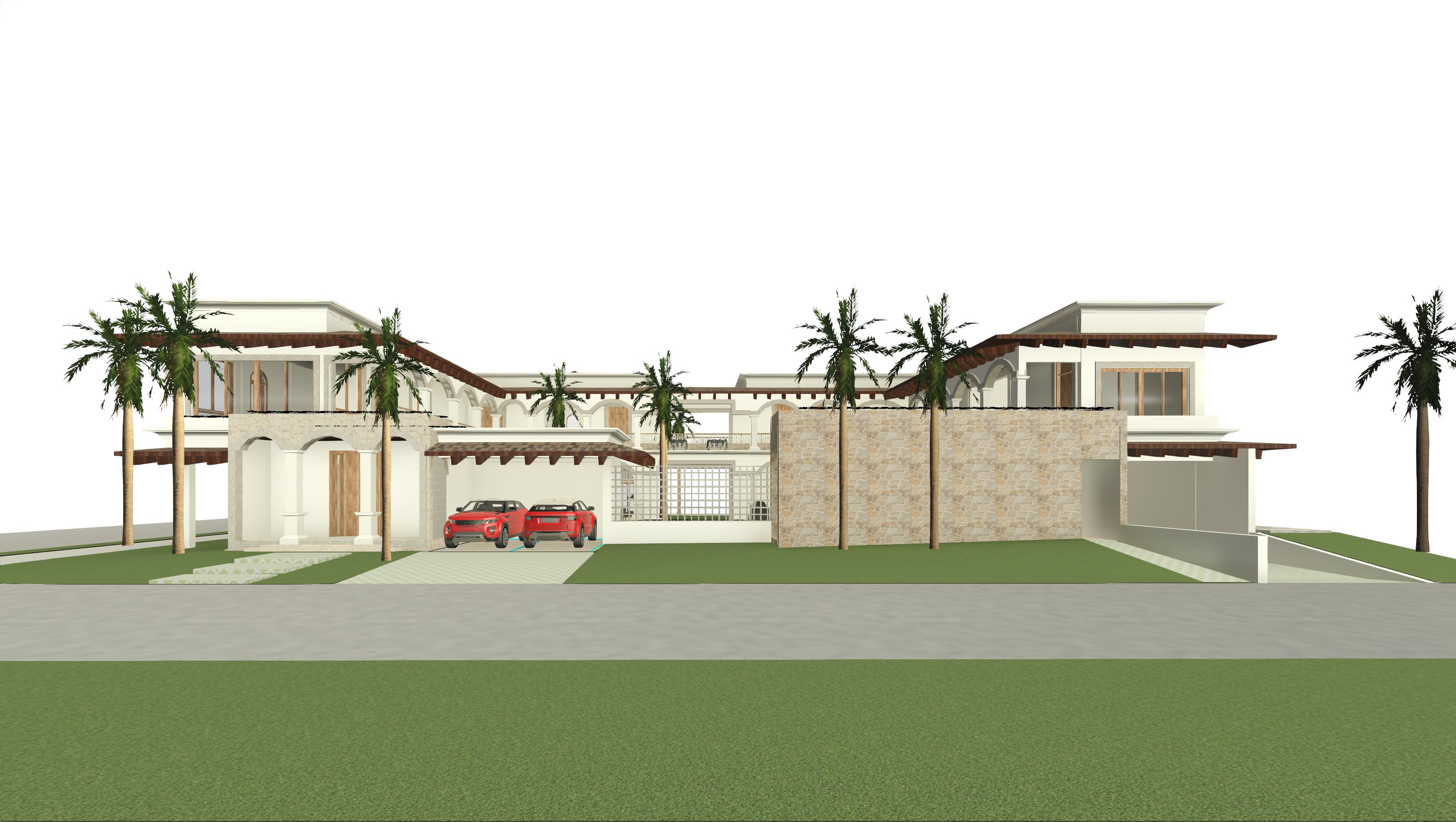 foto realista con entorno tropical y jardin frontal autos de color blanco y gris oscuro