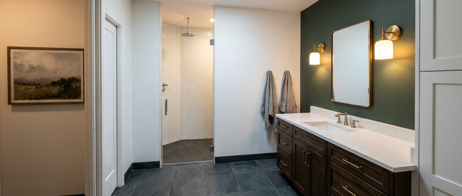 add lush landscape in the front with driveway and walk to front door add mountain lake in background