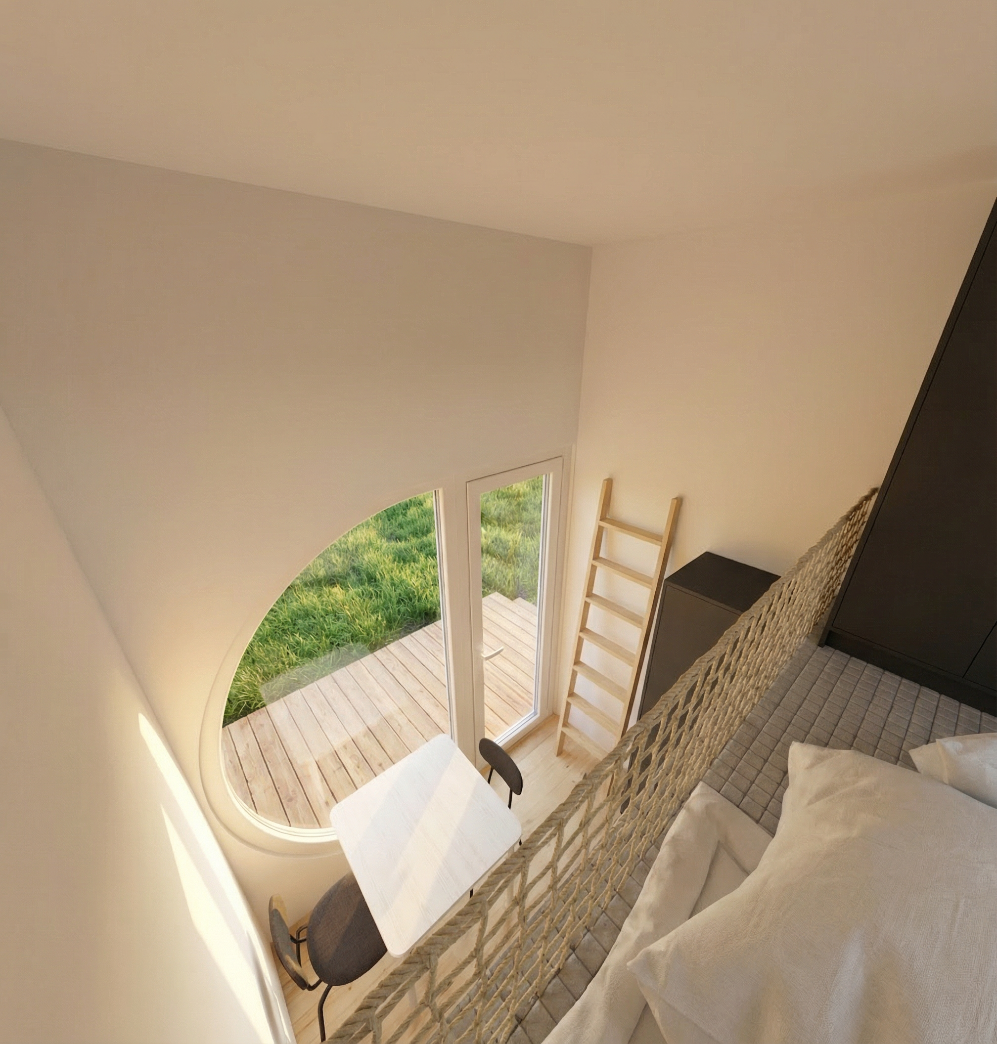 add light wooden ladder on the wall on the right side turned to wall closer to the cabinet add net railings next to the bed half of right side there is no net add more sun light outside the window wooden deck and grass